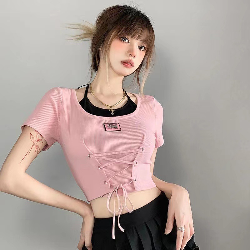 复古小众设计感上衣女夏季撞色BF风甜心辣妹系带独特挂脖T恤短袖