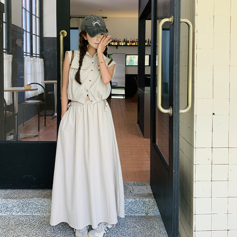 夏季新款时尚气质韩系工装套装短袖衬衫设计高腰半身裙两件套