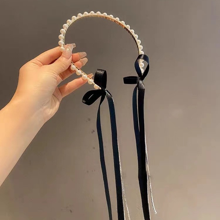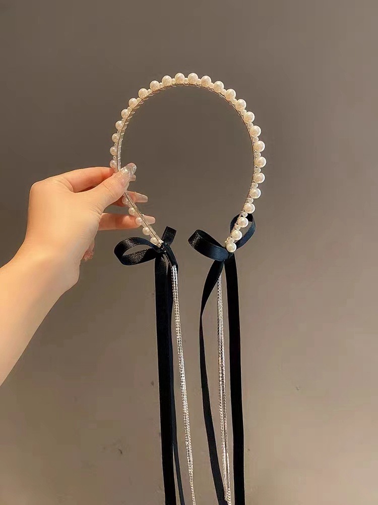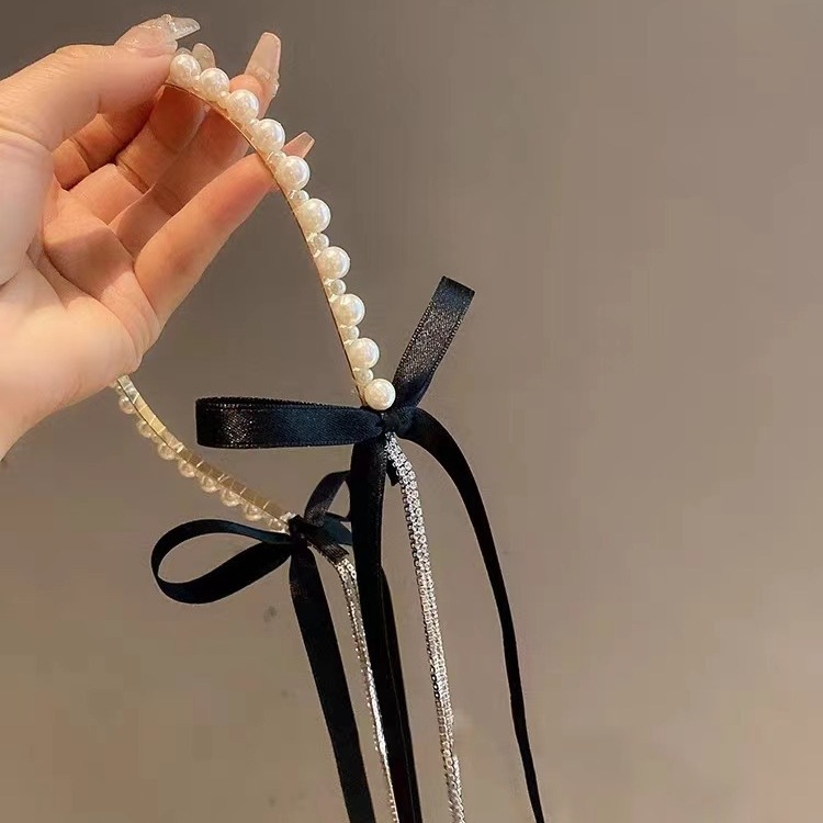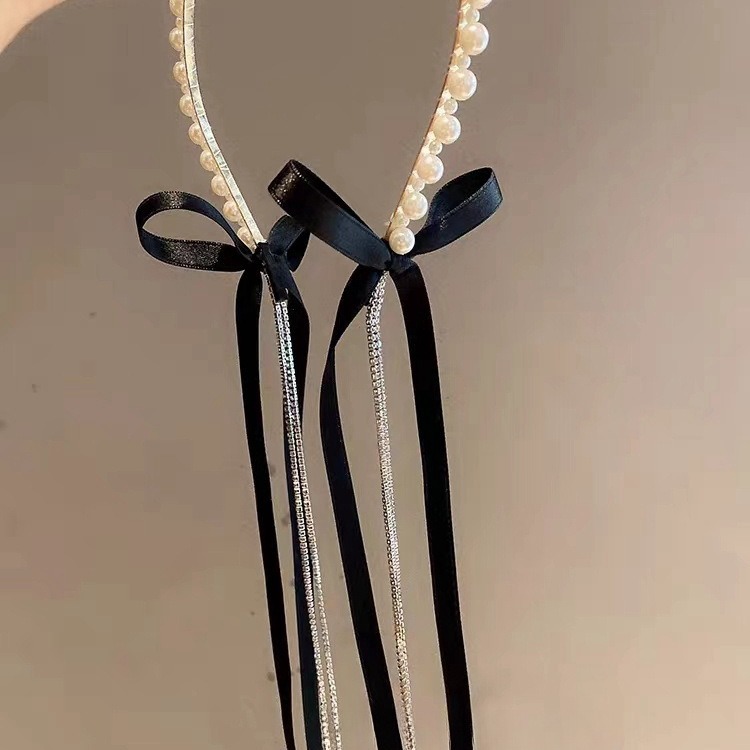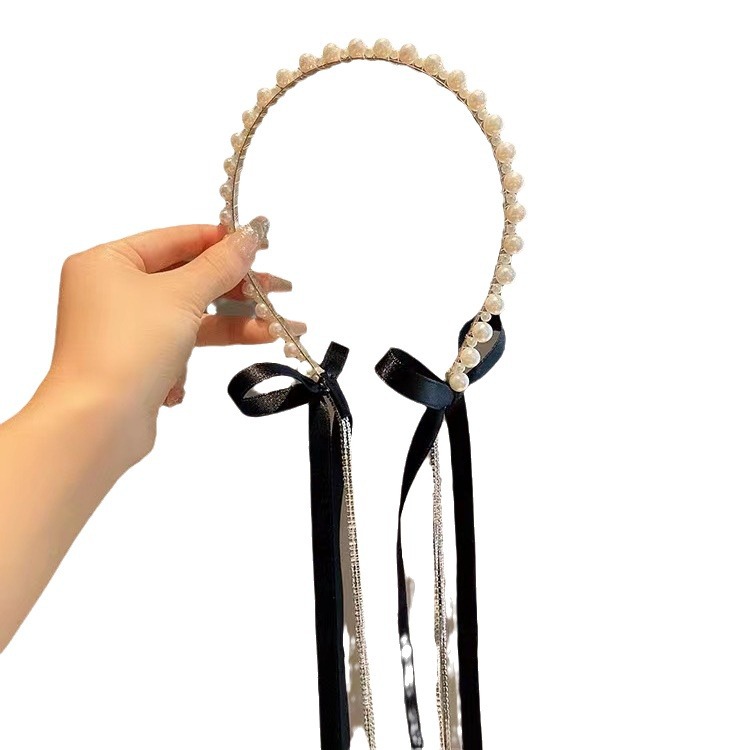 韩版新款财阀千金小姐黑色蝴蝶结闪钻流苏发箍女小众珍珠气质发卡