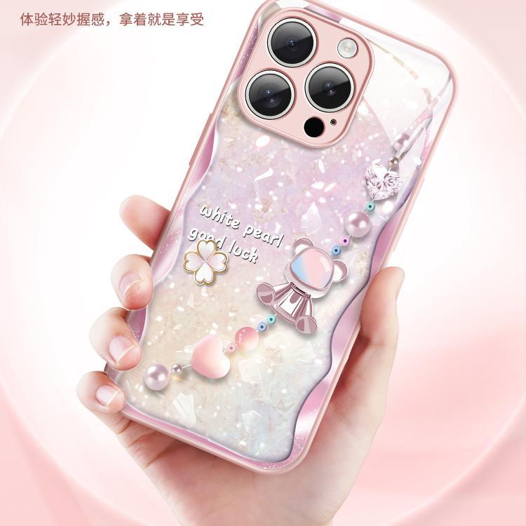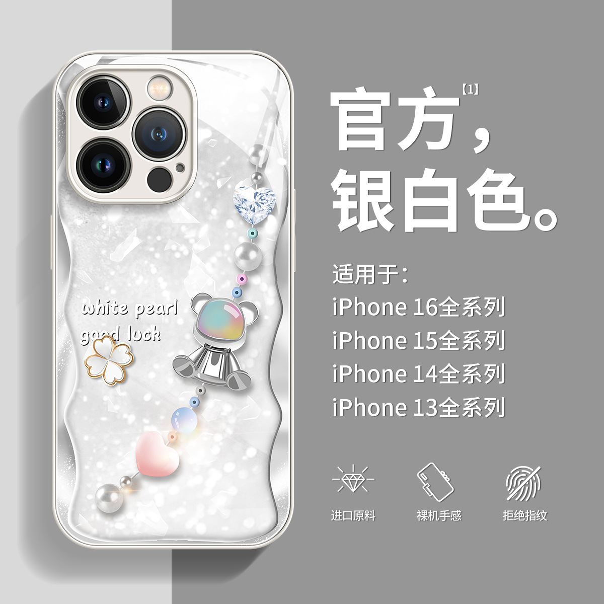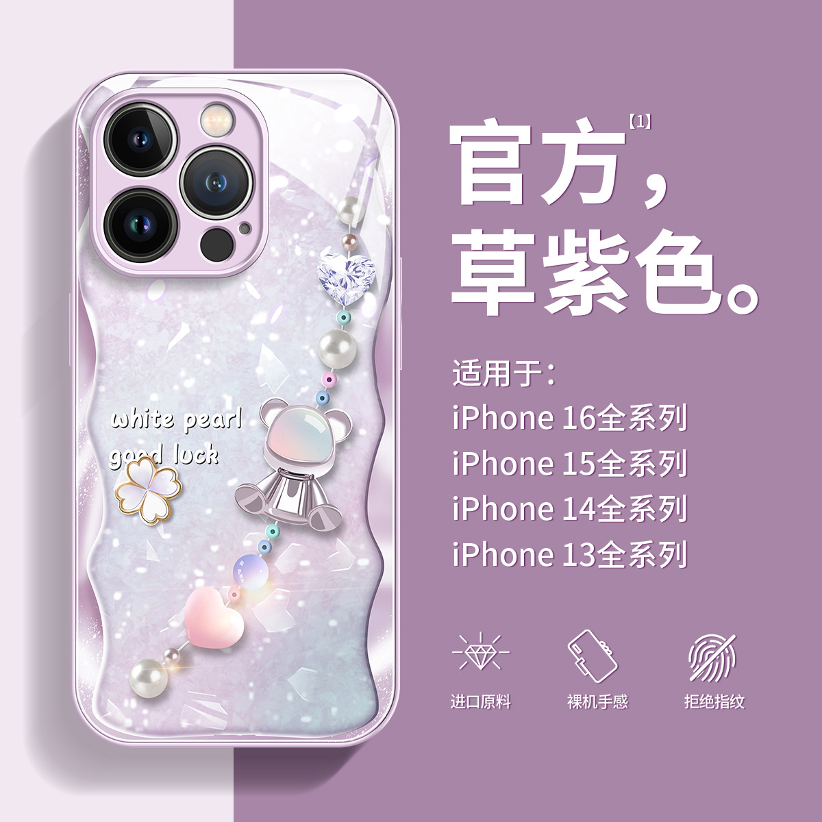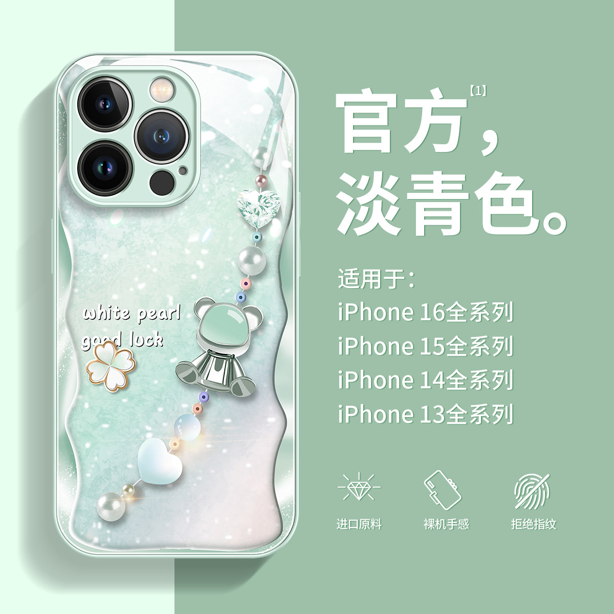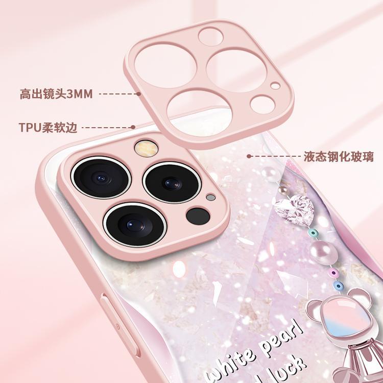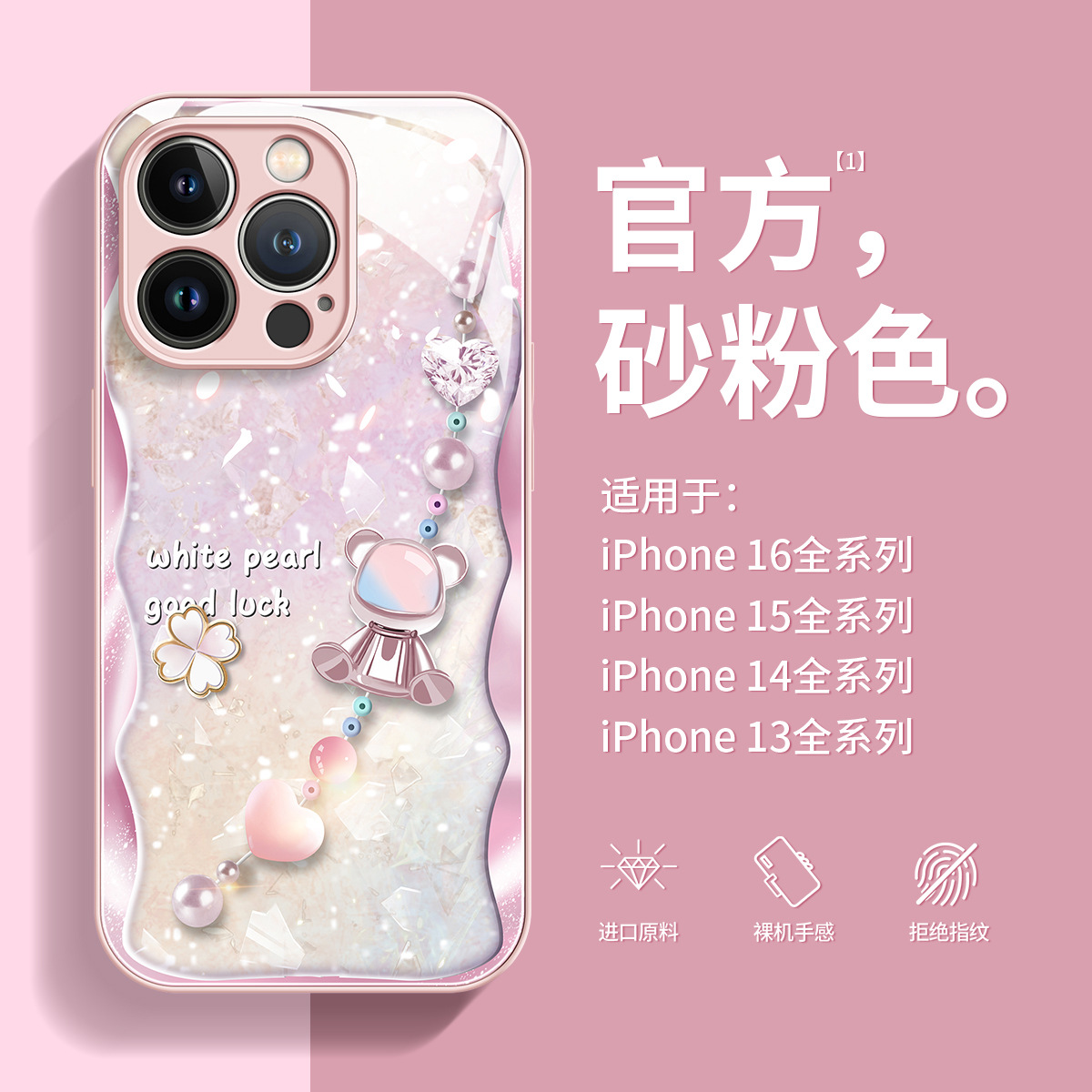 适用于苹果16Promax手机壳闪钻熊抗指纹全包iphone14玻璃高颜值防