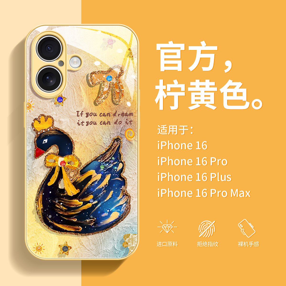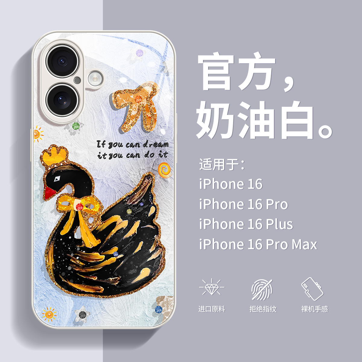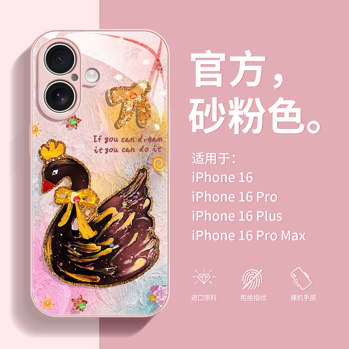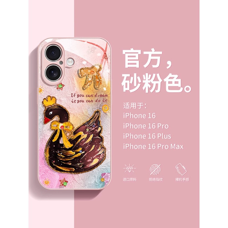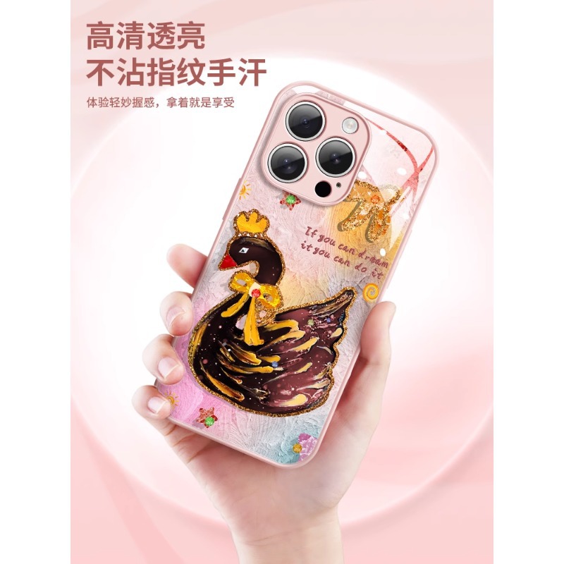适用于苹果16Promax手机壳卡通%黑天鹅随机词1%全包iphone15玻璃