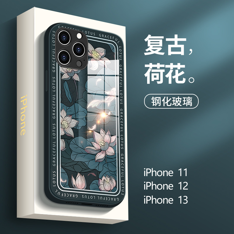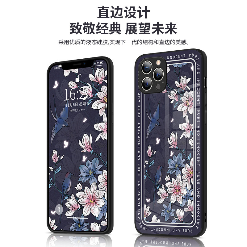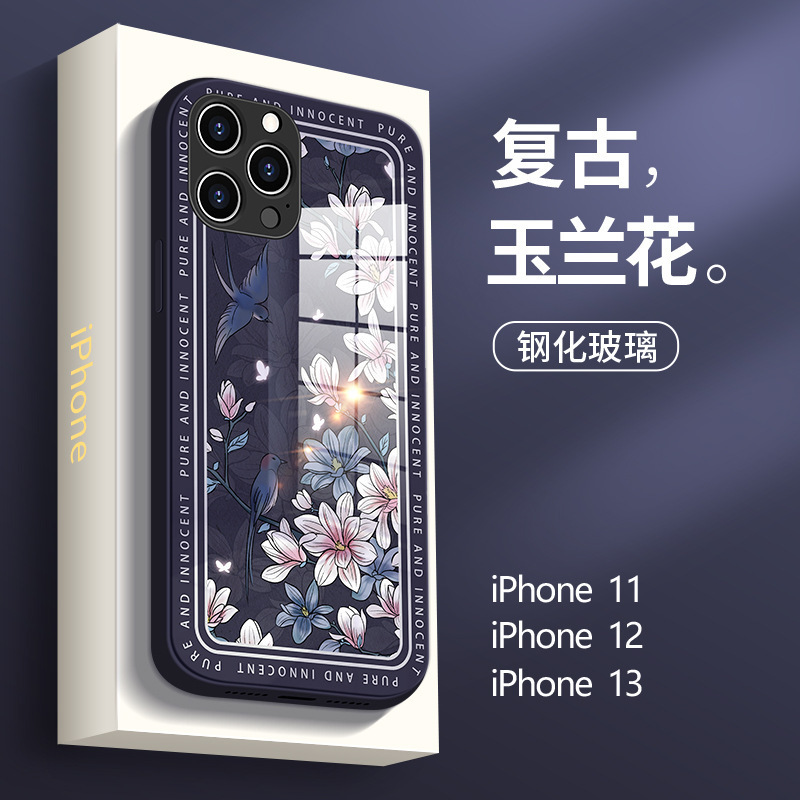 适用于苹果13手机壳新款玻璃玉兰花iphone12镜头全包防摔11手机套
