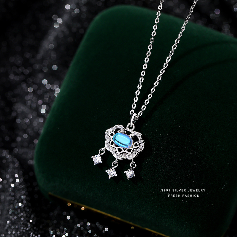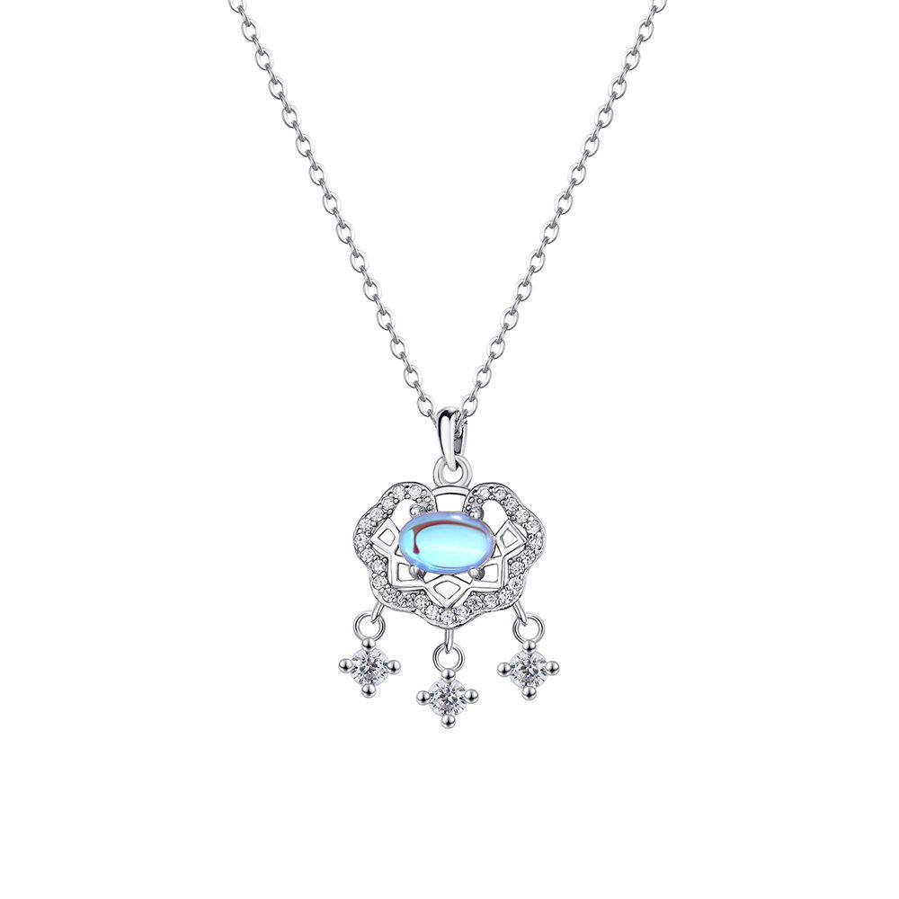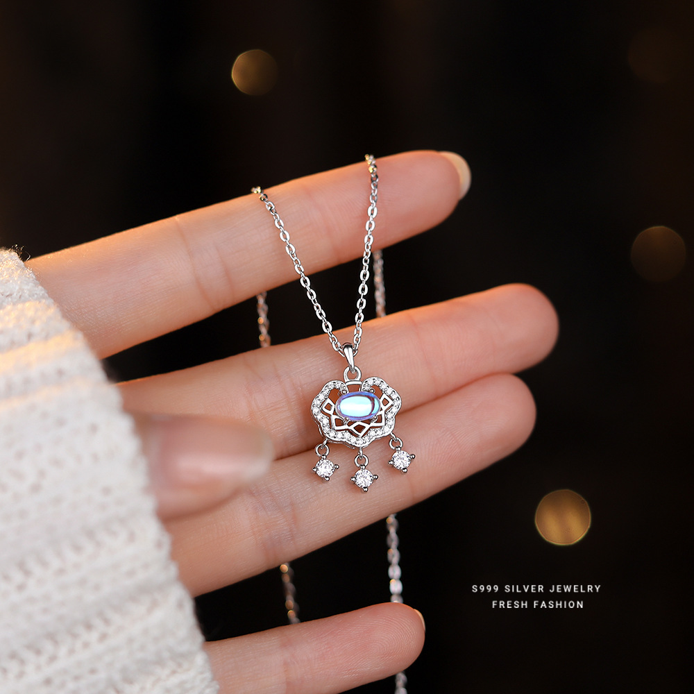 s999足银平安锁项链轻奢小众国风本命年复古气质锆石月光石锁骨链