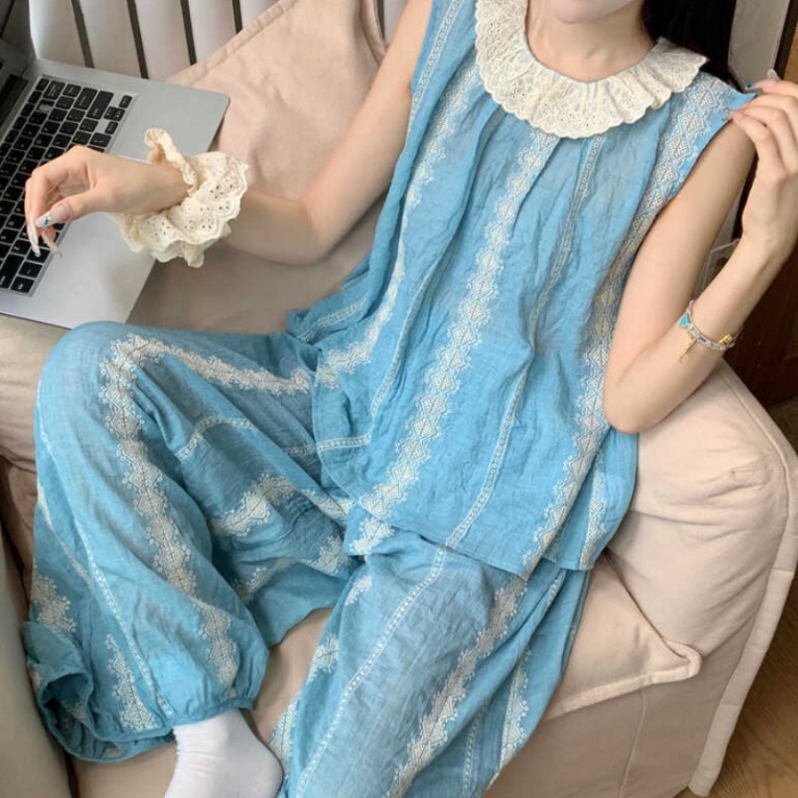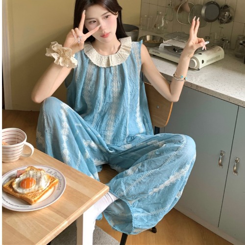韩版无袖睡衣女士夏季新款蕾丝背心长裤甜美休闲宫廷风家居服套装