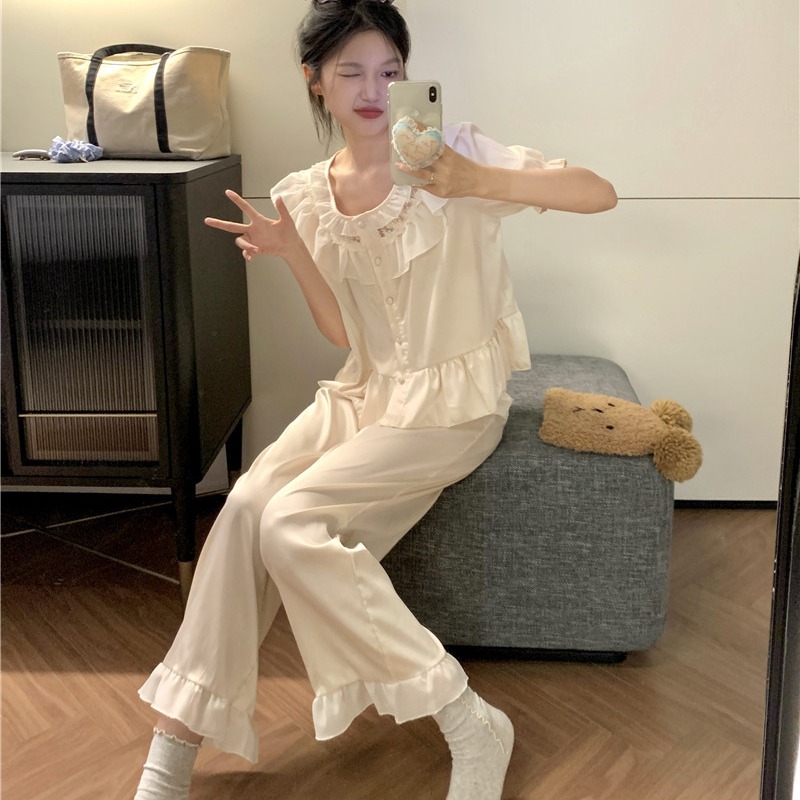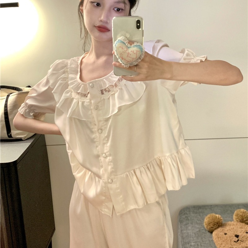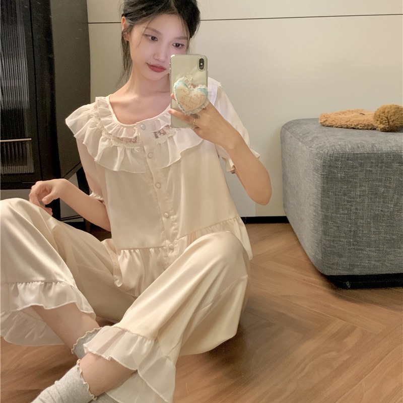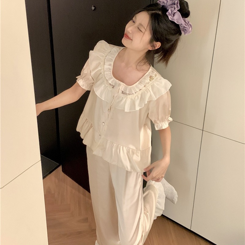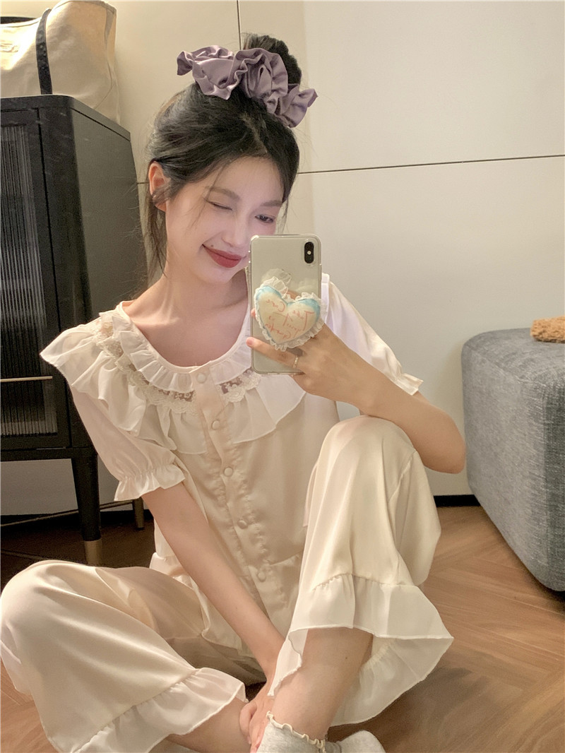 法式宫廷风蕾丝荷叶边圆领冰丝短袖长裤睡衣甜美宽松家居服套装女
