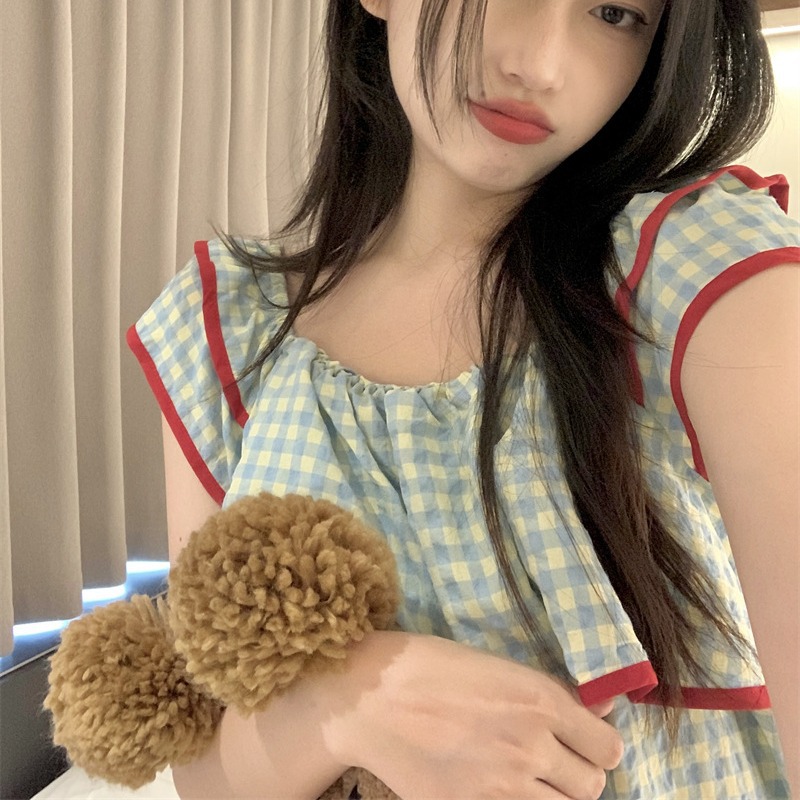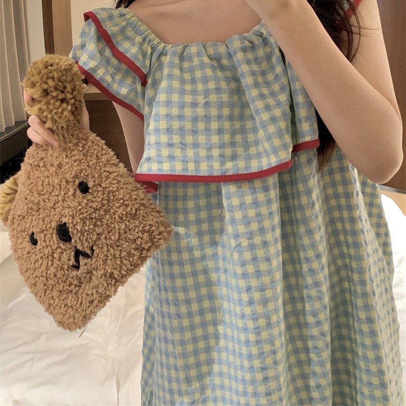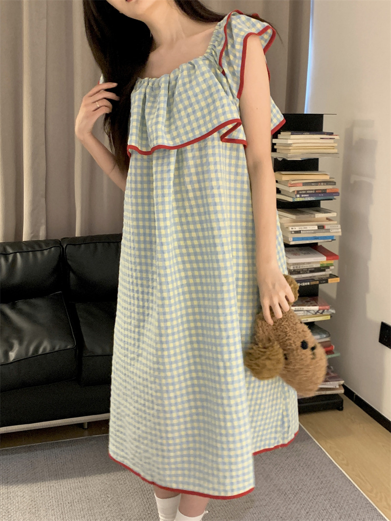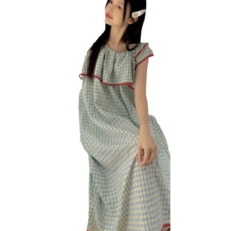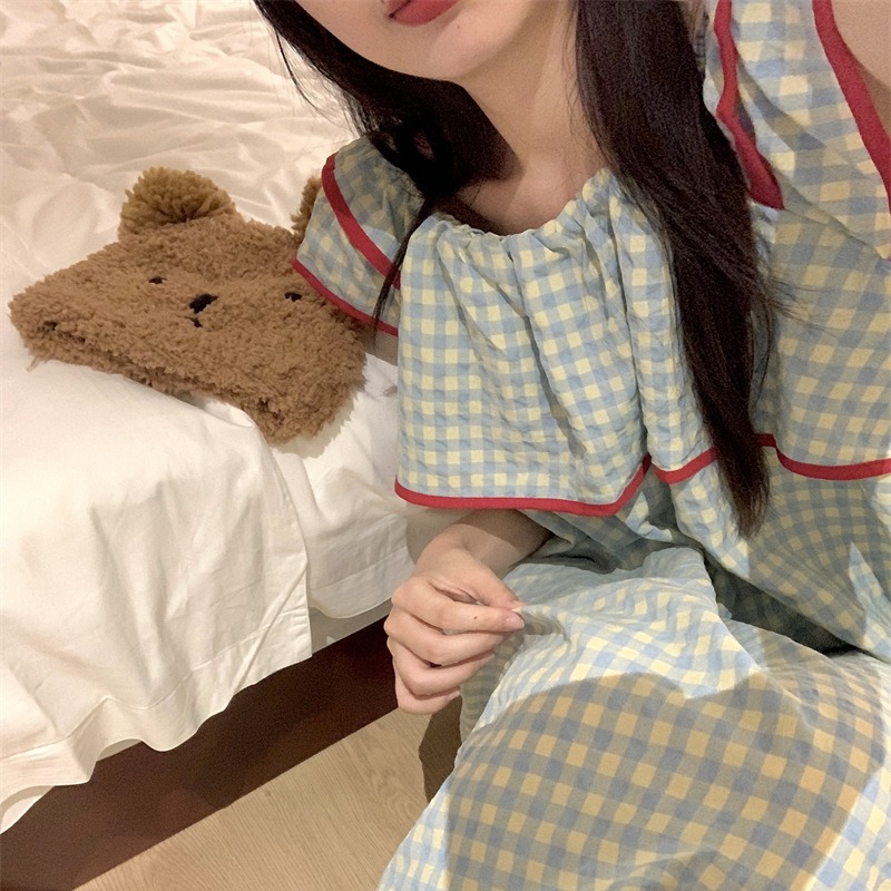 韩系睡衣女夏季荷叶边撞色格子年新款学生网红简约睡裙家居服