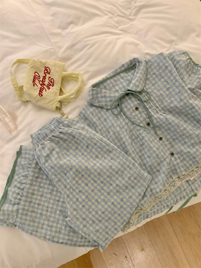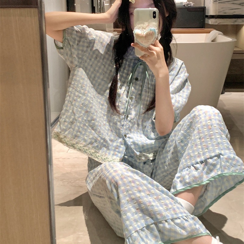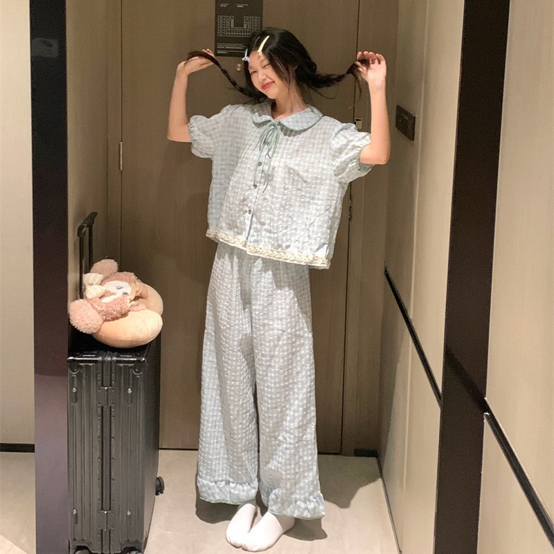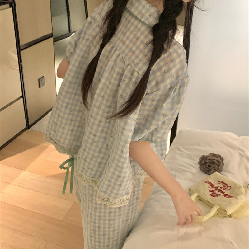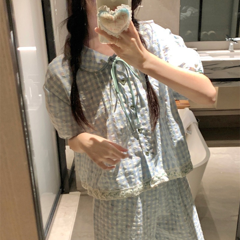 韩国ins夏日新品甜美公主风格子碎花短袖长裤睡衣女娃娃领家居服