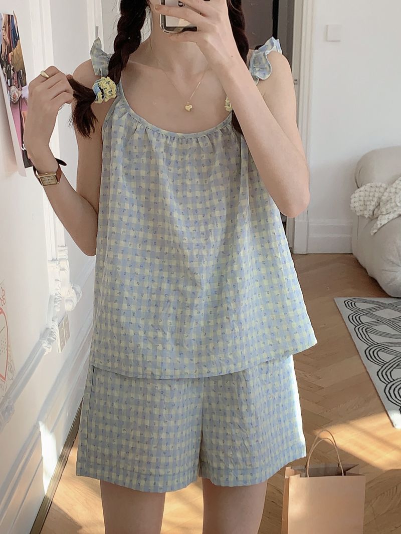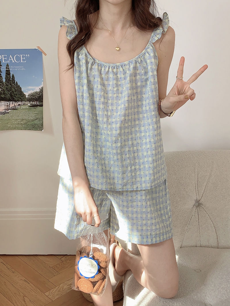 碎花格子吊带短裤睡衣女夏季新款韩版甜美ins网红少女家居服套装