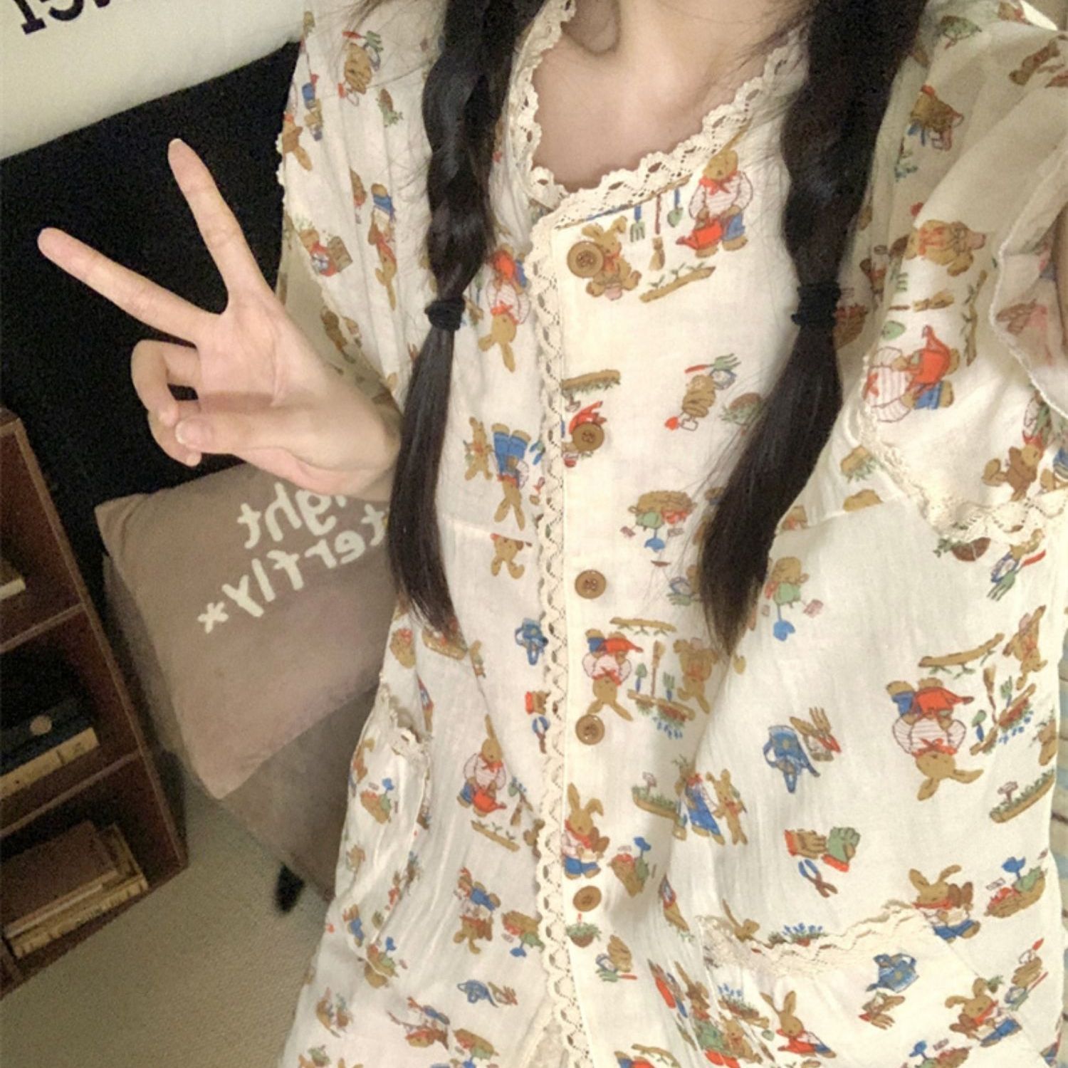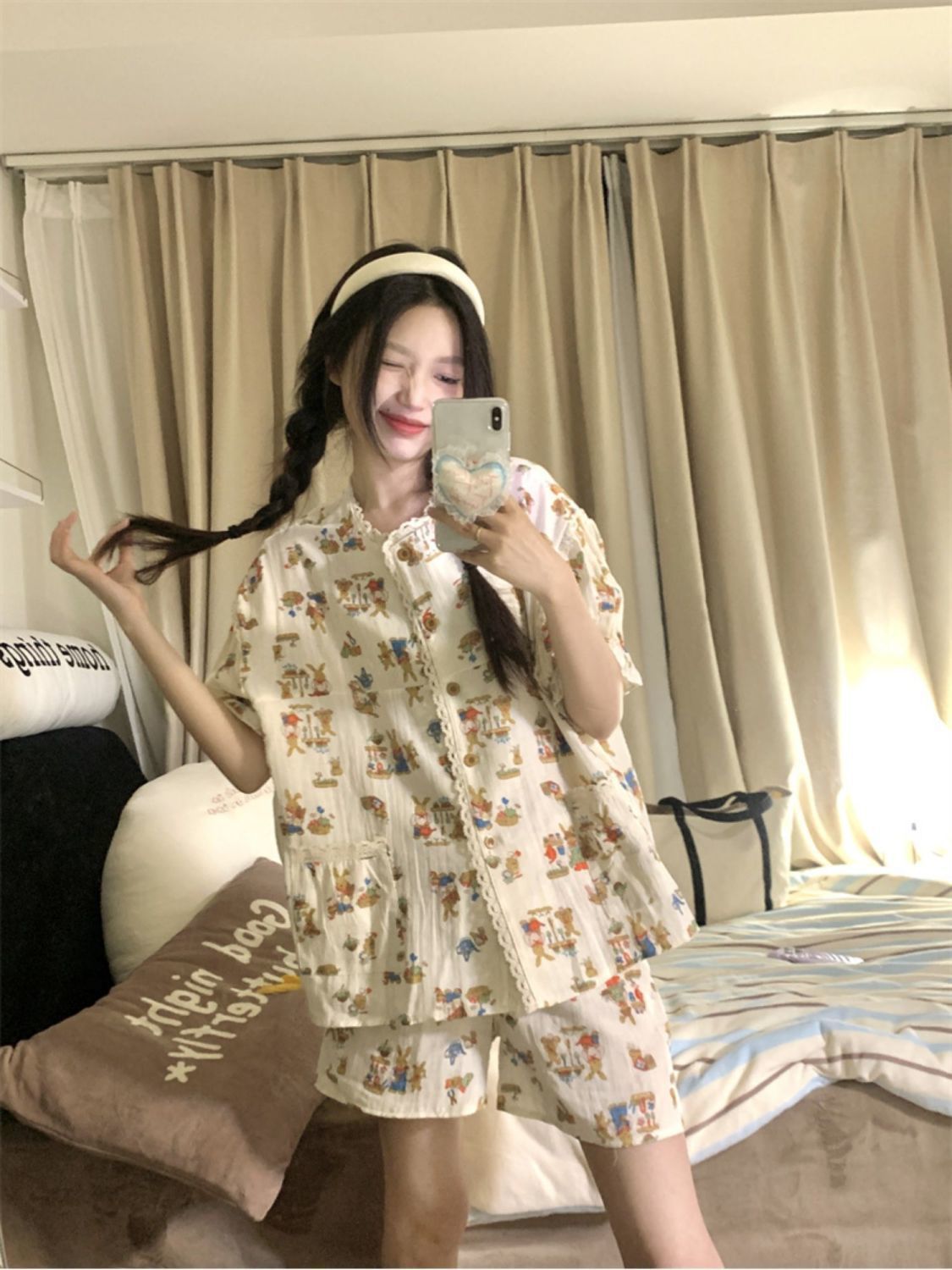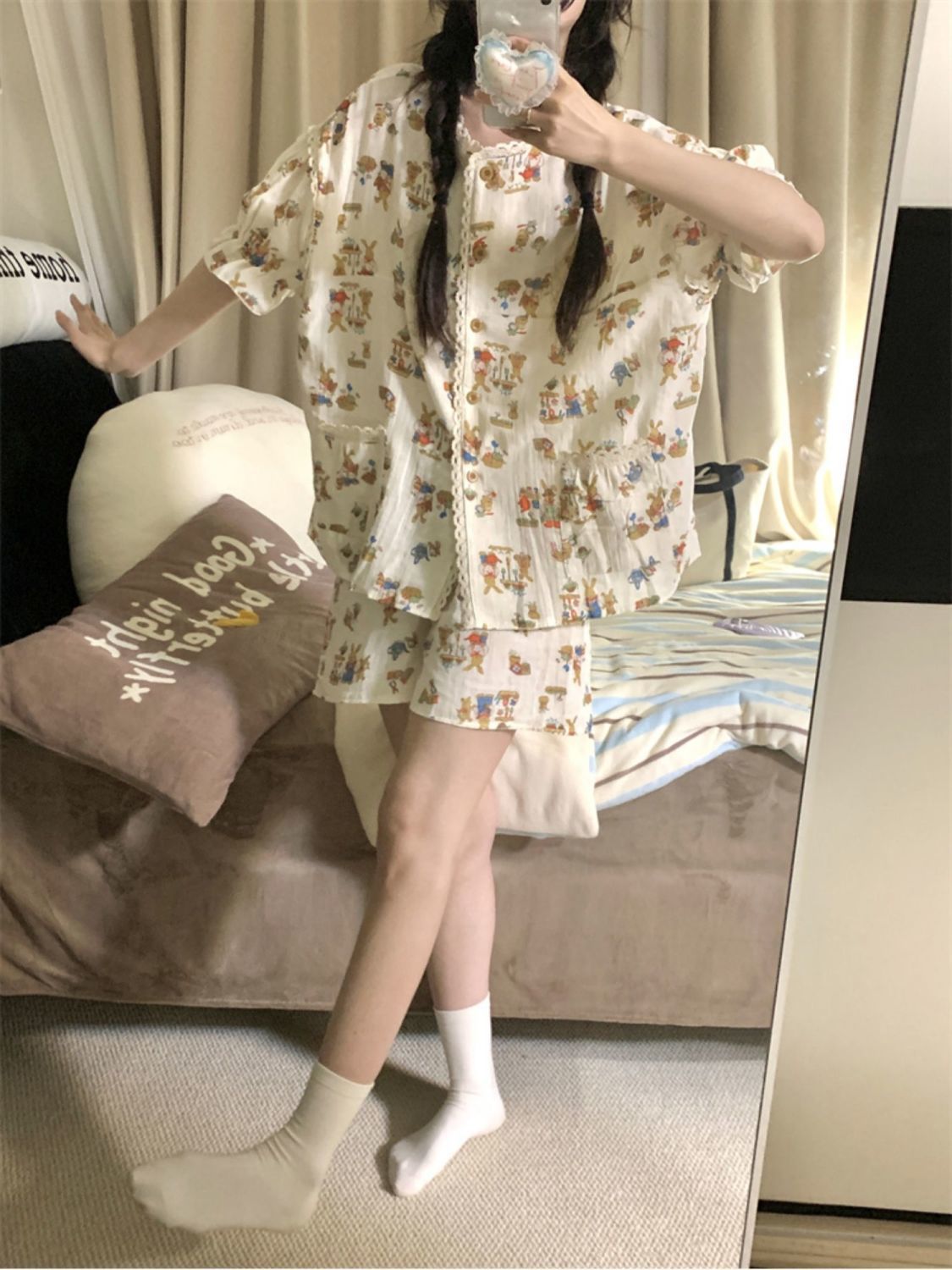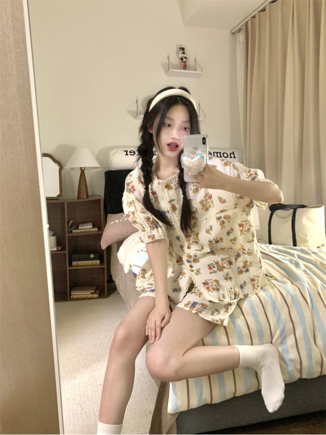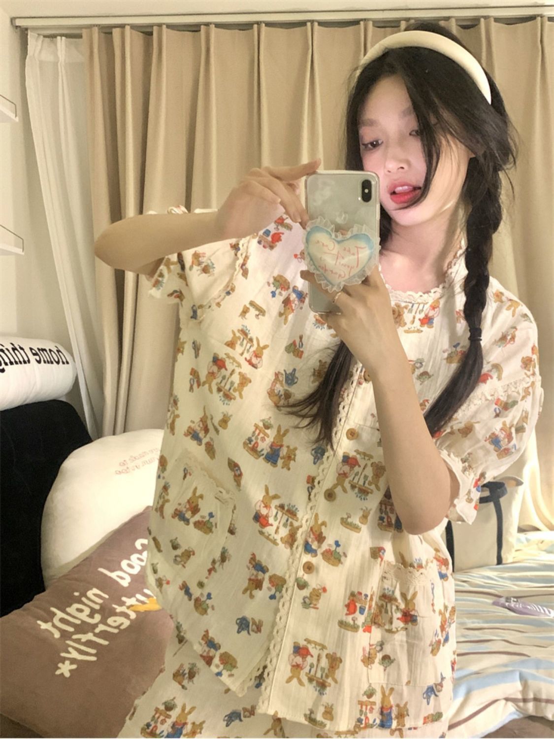 新款ins蕾丝花边睡衣女夏季可爱兔子网红短袖短裤家居服套装