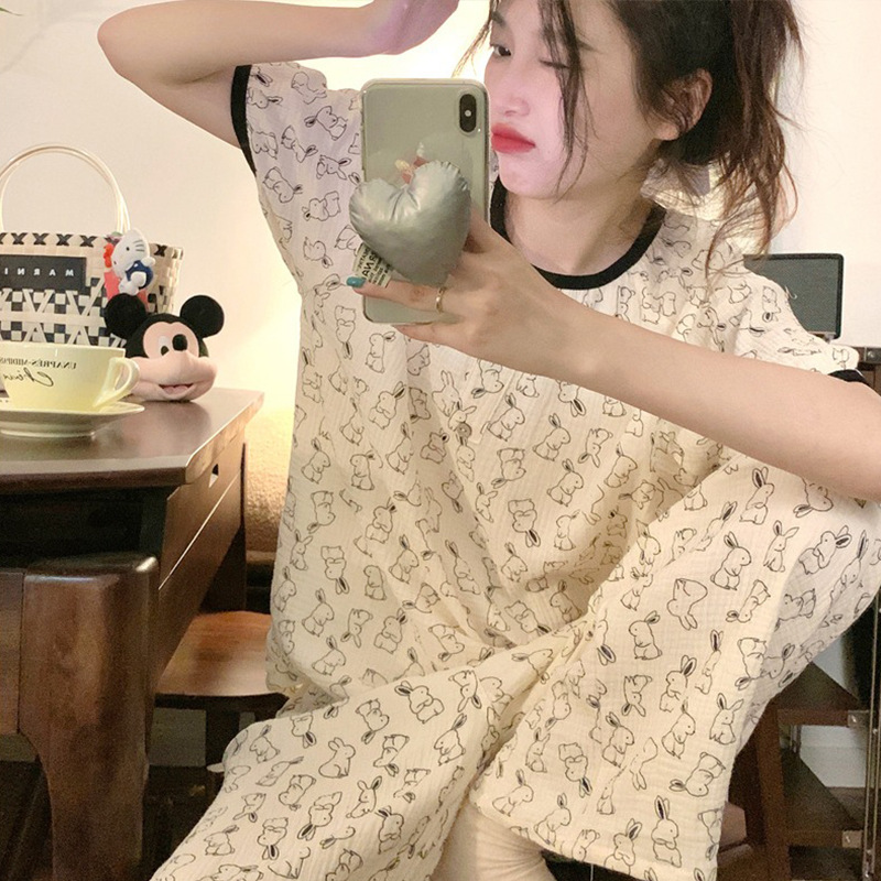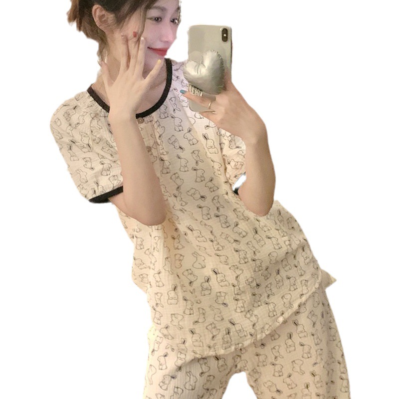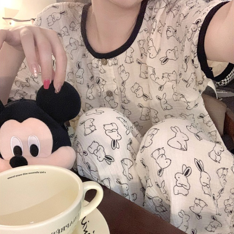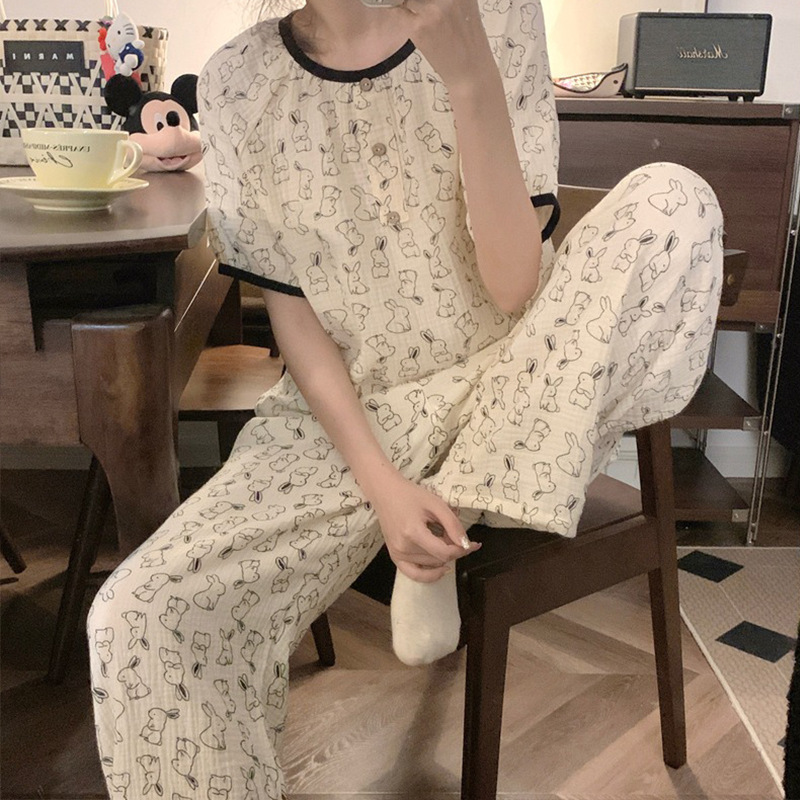 睡衣女夏季短袖长裤年新款韩版简约可爱小兔子家居服两件套装