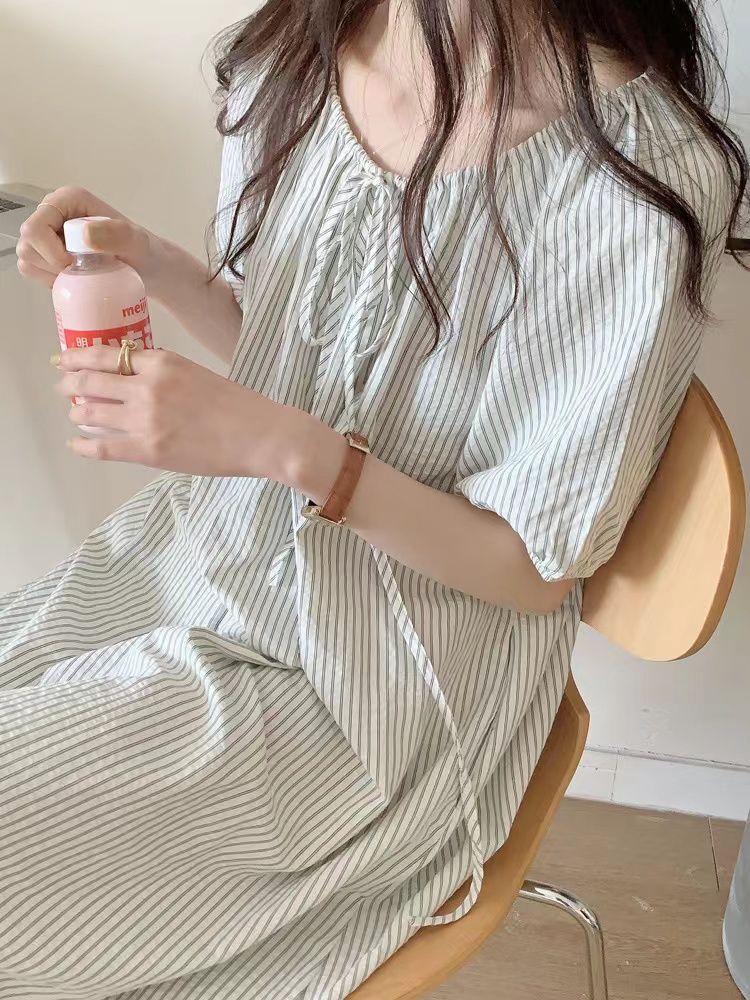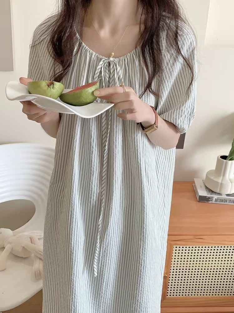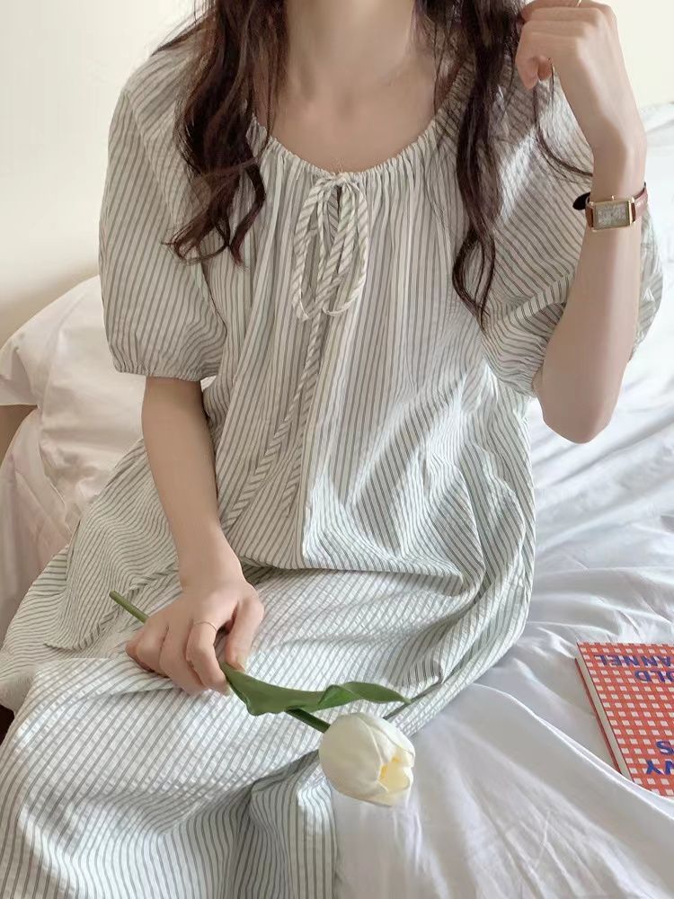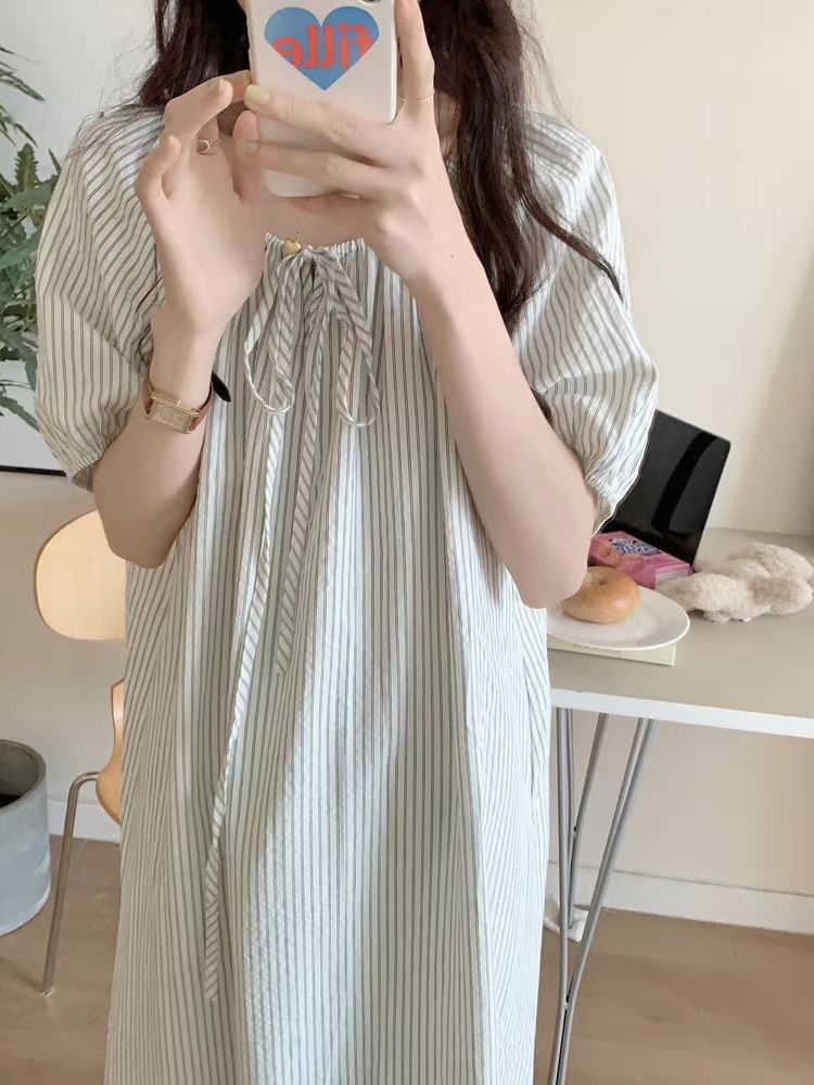 韩国简约睡裙女夏季短袖宽松条纹网红少女ins系带花边睡衣家居服
