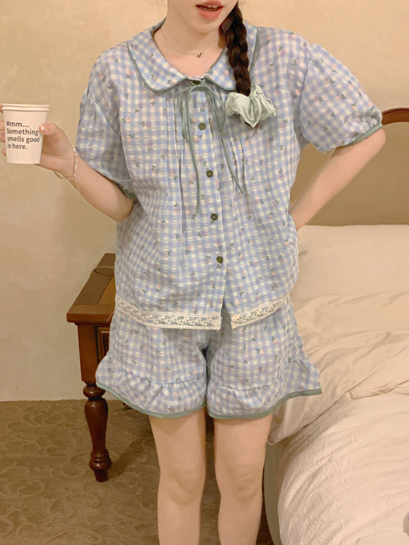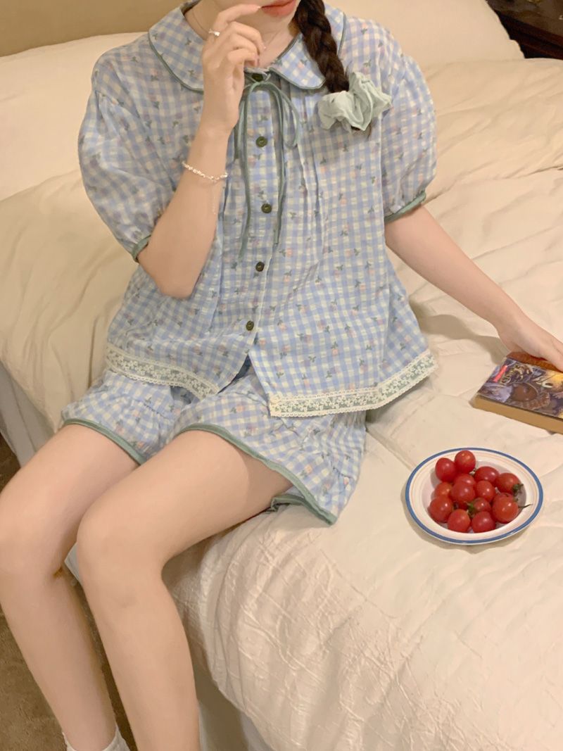 蕾丝花边韩版ins风甜美碎花睡衣夏季新款网红短袖短裤家居服套装