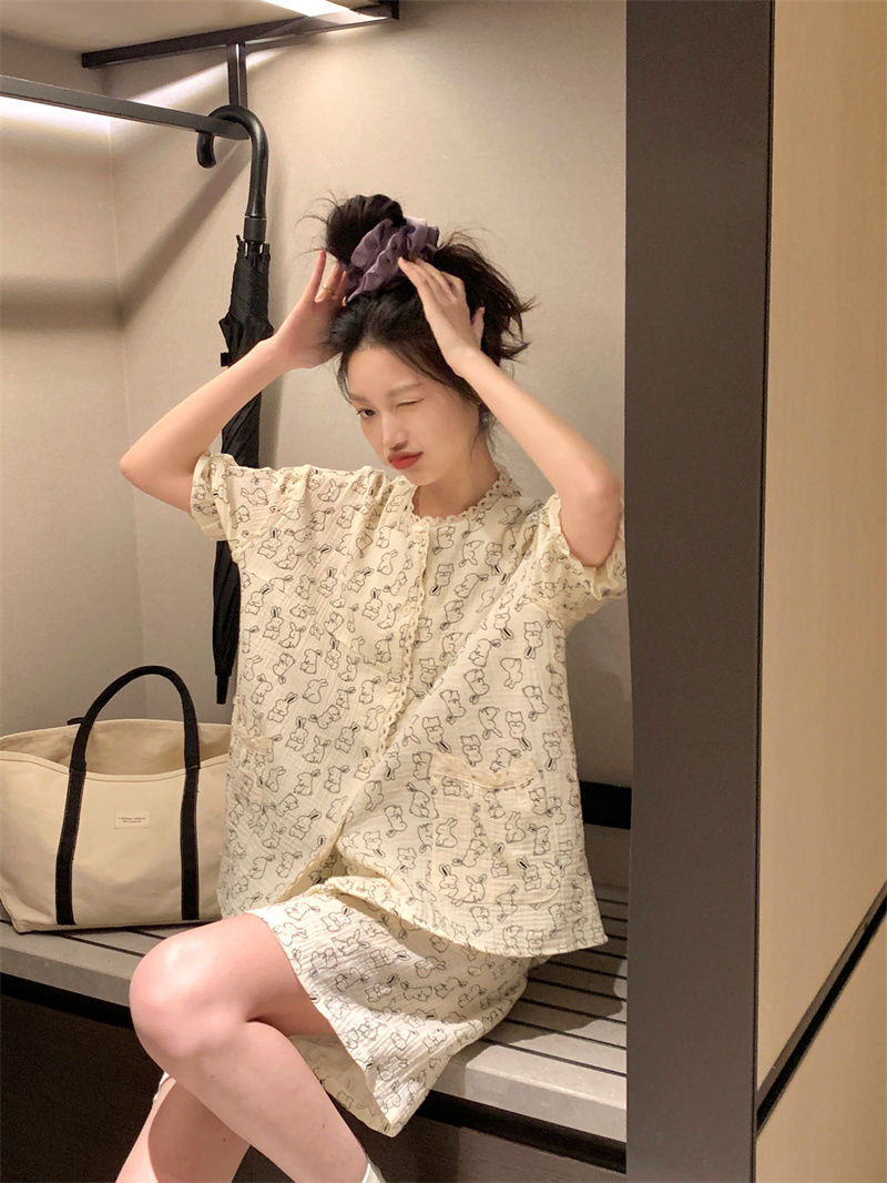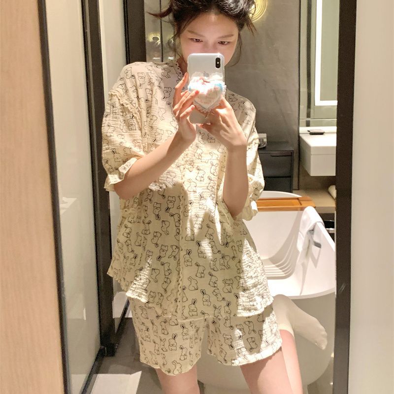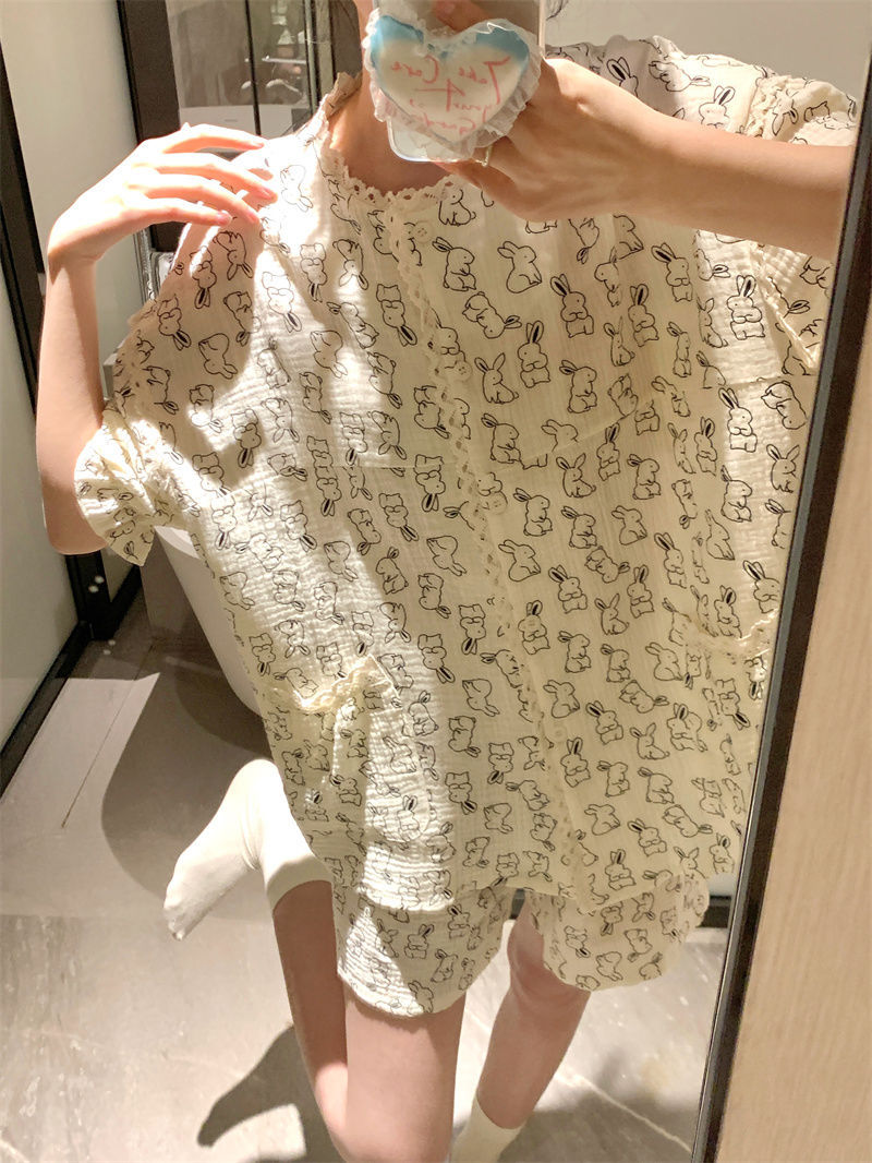 ins风可爱卡通睡衣夏季新款日系网红少女蕾丝开衫短袖家居服套装