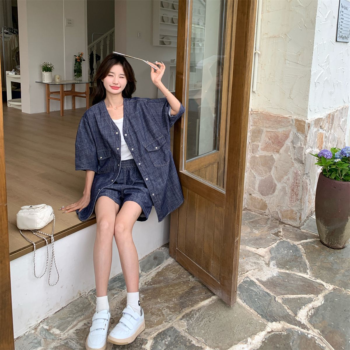 复古牛仔套装女夏季设计感显瘦柔软薄牛仔短袖衬衣短裤两件套