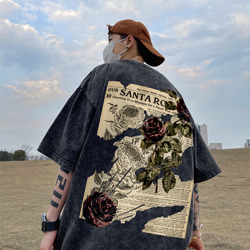 美式短袖T恤男款夏季重磅水洗宽松大码潮牌高街复古玫瑰印花半袖
