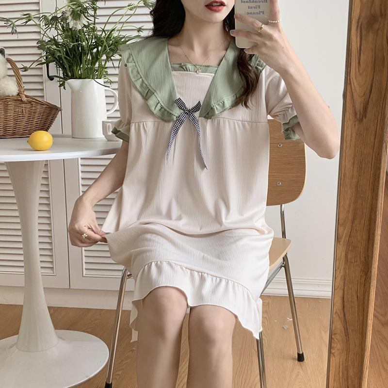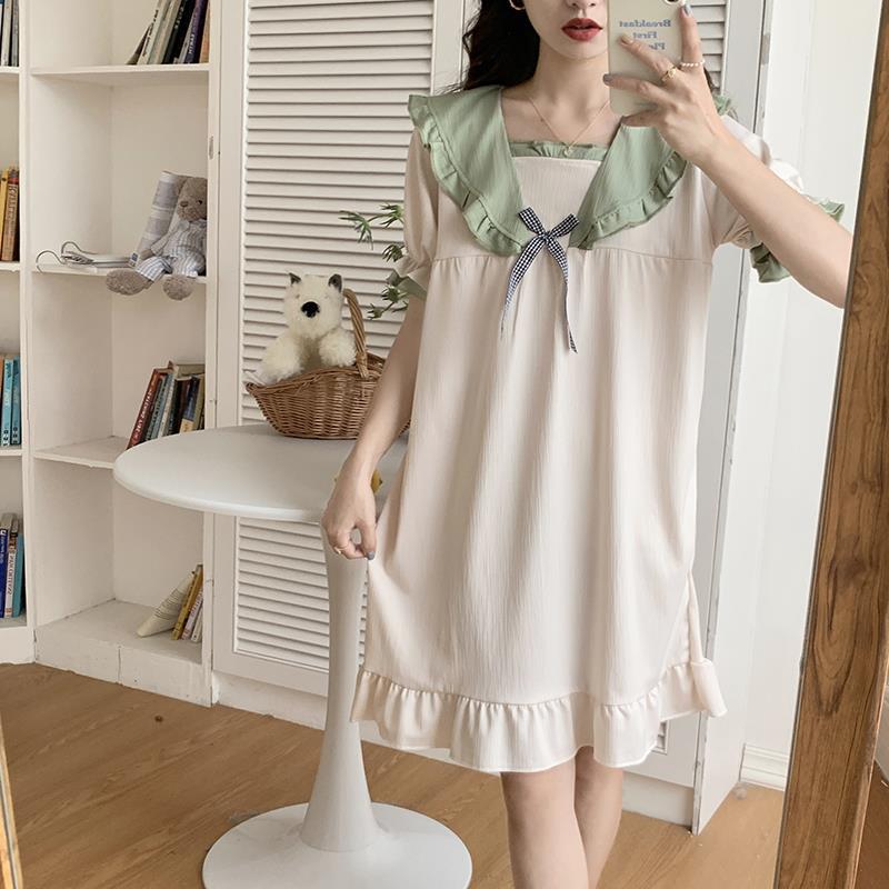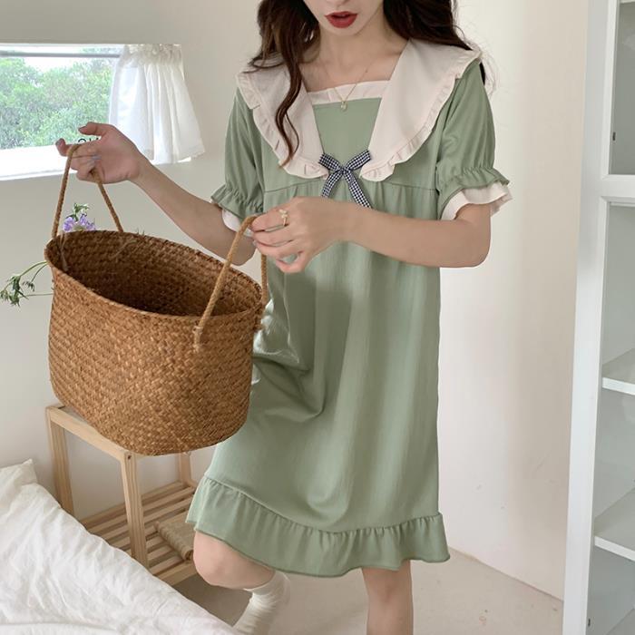 清新花边睡裙女夏季薄款棉质短袖夏天蝴蝶结宽松家居服连衣裙外穿