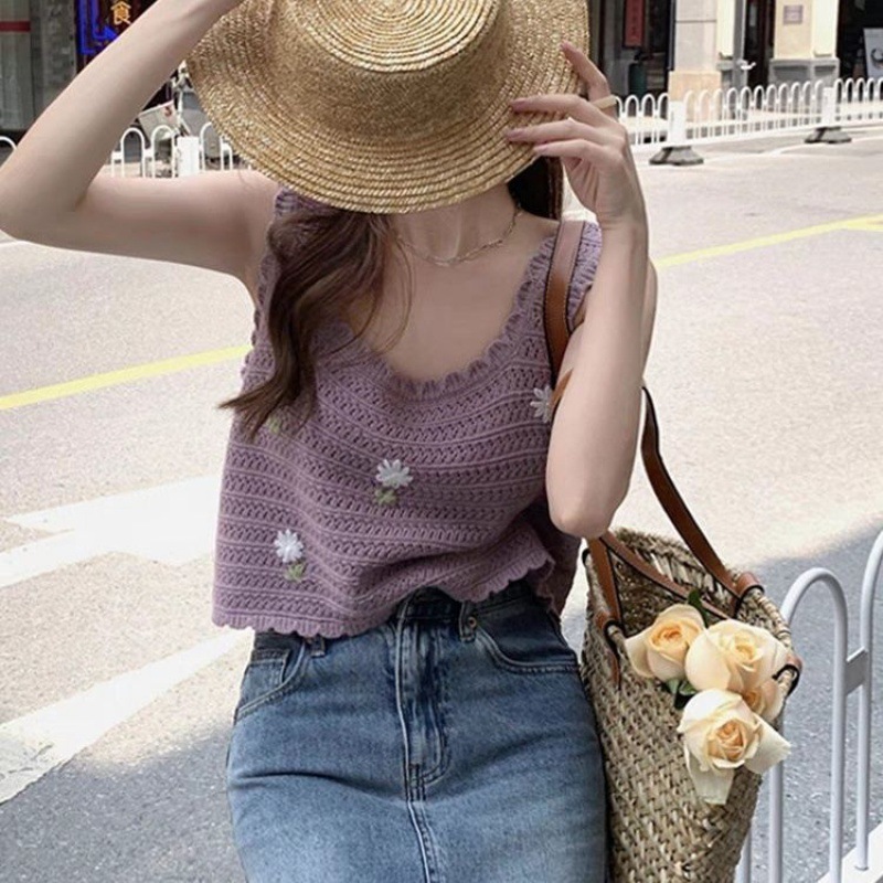 法式刺绣设计感方领针织吊带内搭小背心夏季紫色别致无袖短上衣女
