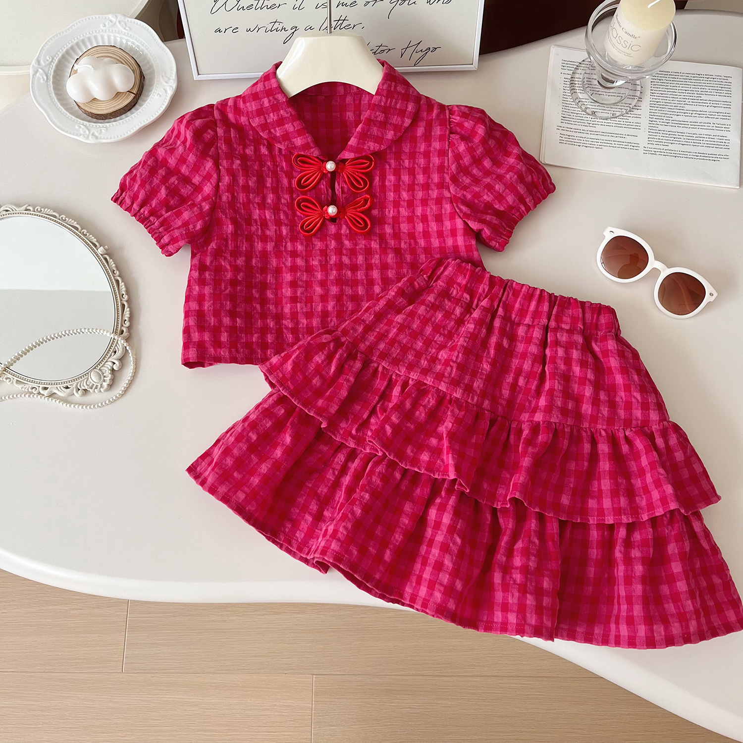 童装2025夏季新款韩版女童小方格短袖裙套装女孩洋气纯色小套装