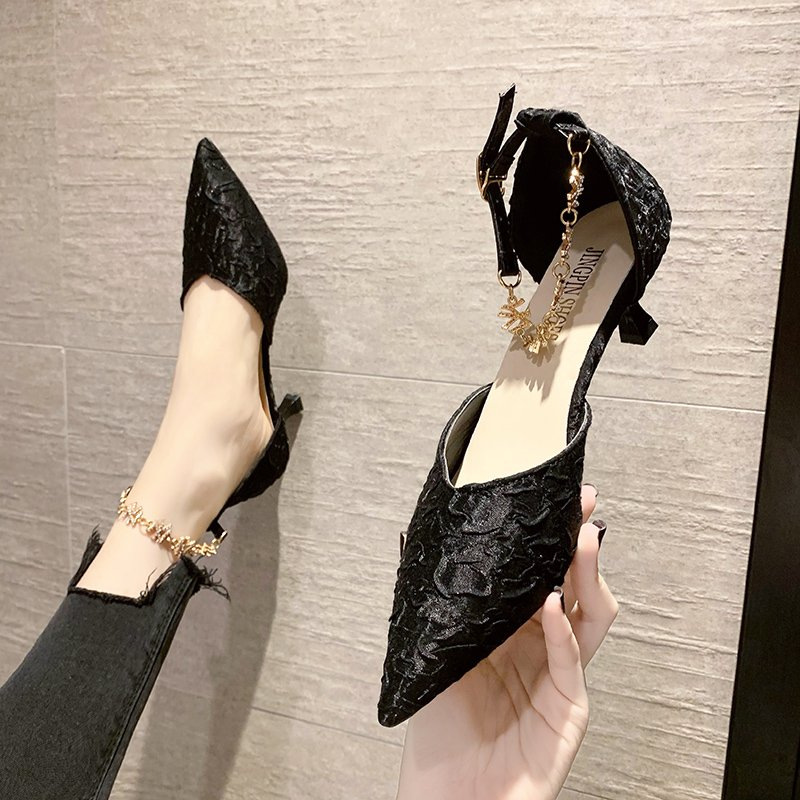 高跟鞋女中跟春夏新款韩版一字带包头凉鞋细跟尖头小香风单鞋