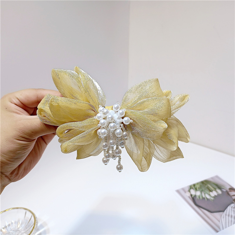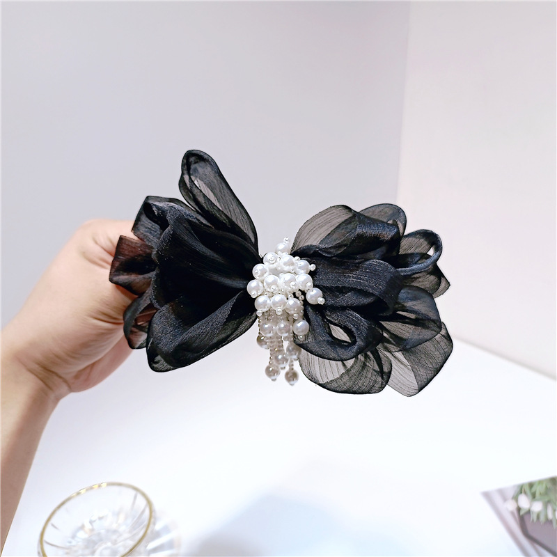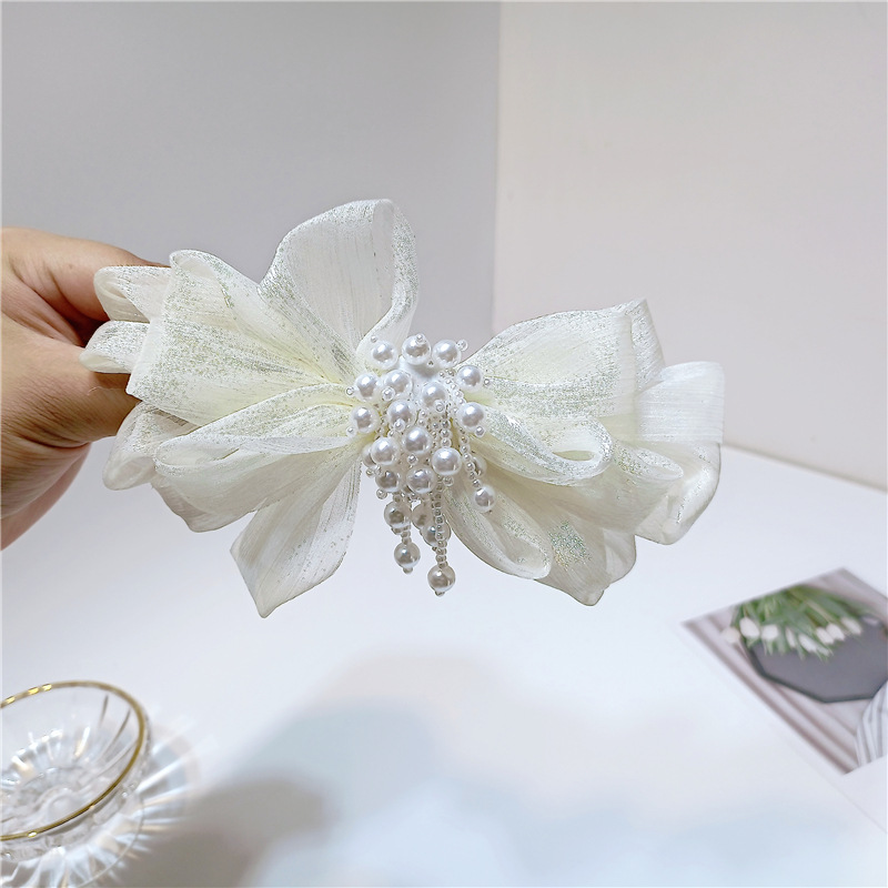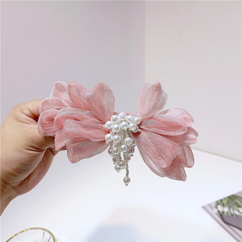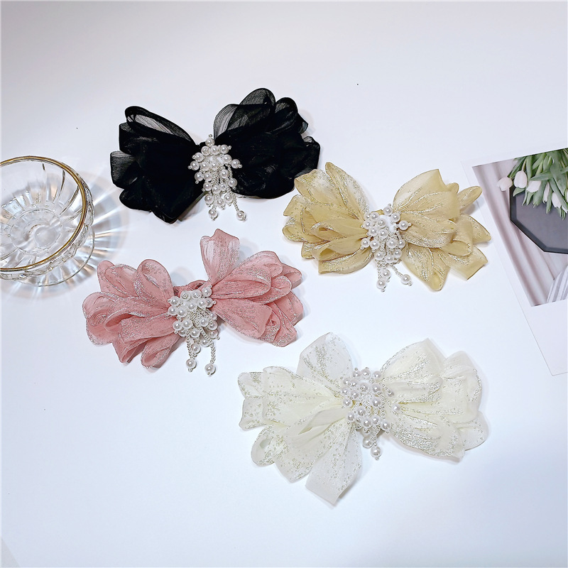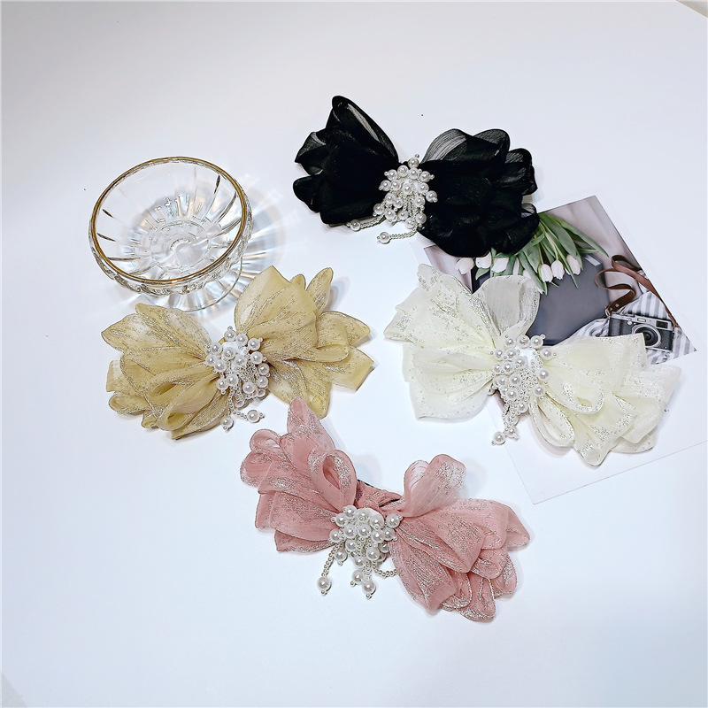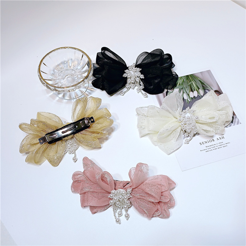韩国新款绢纱珍珠蝴蝶结发夹顶夹后脑勺夹子日韩网红欧根纱头发饰