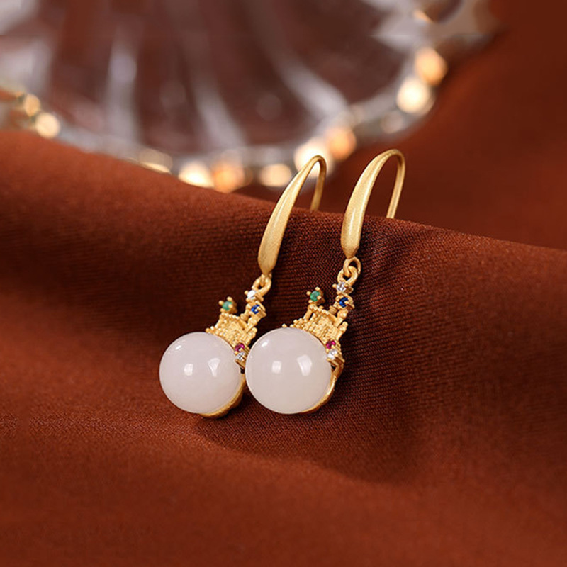 几何镀金镶嵌锆石城堡耳环轻奢时尚和田白玉宫廷风耳坠耳饰女士