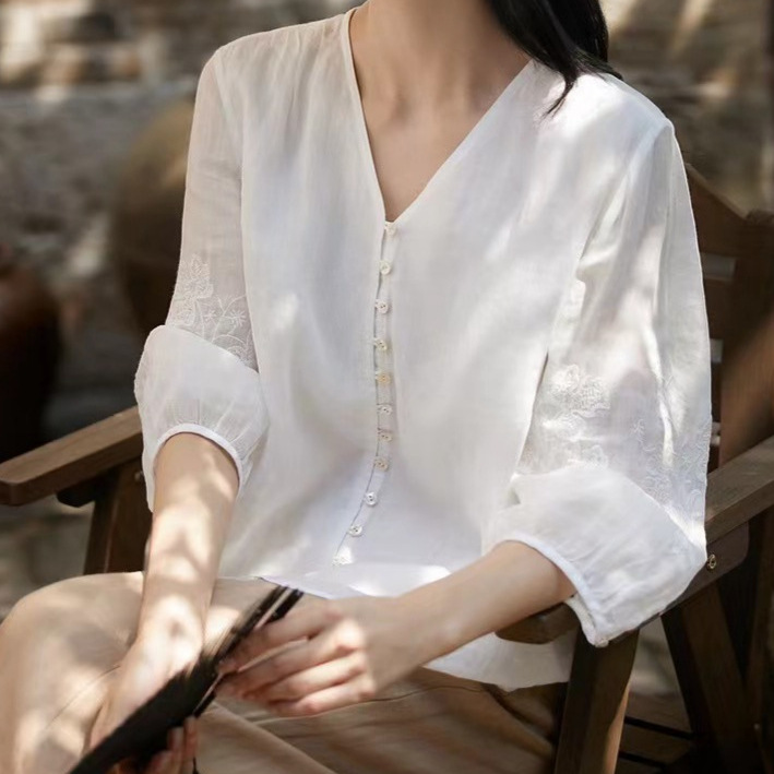 |人间缪斯|灵动飘逸呼吸感苎麻v领刺绣衬衫廓形衬衫小上衣女