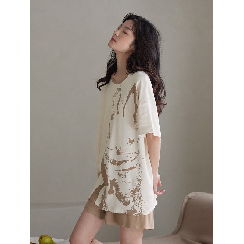带胸垫睡衣女夏天短袖纯棉可外穿兔子印花凉感型薄款家居服套装