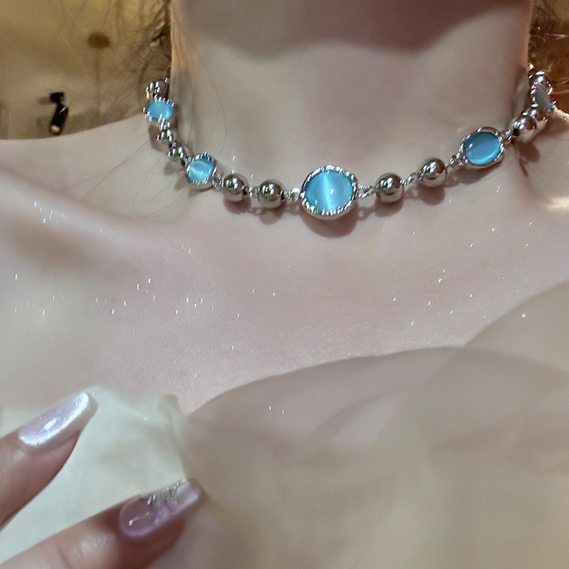 冷淡风蓝色猫眼石链条拼接项链女气质轻奢高级感锁骨链新款