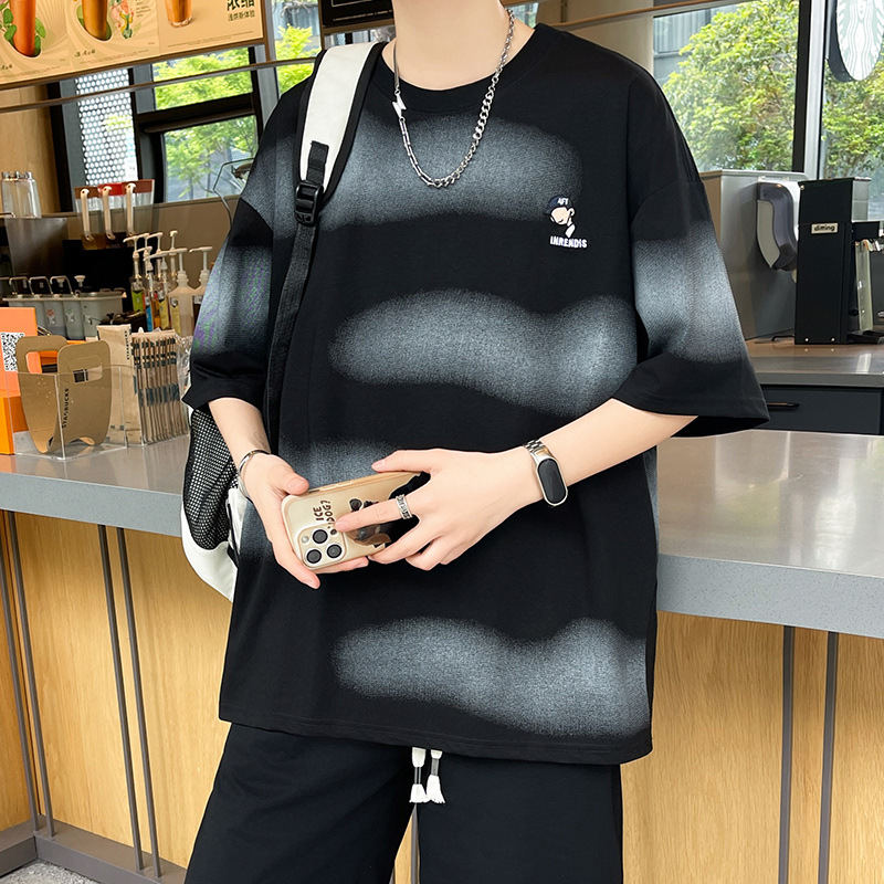 夏季新款短袖T恤男青少年渐变色高冷学生装五分袖上衣