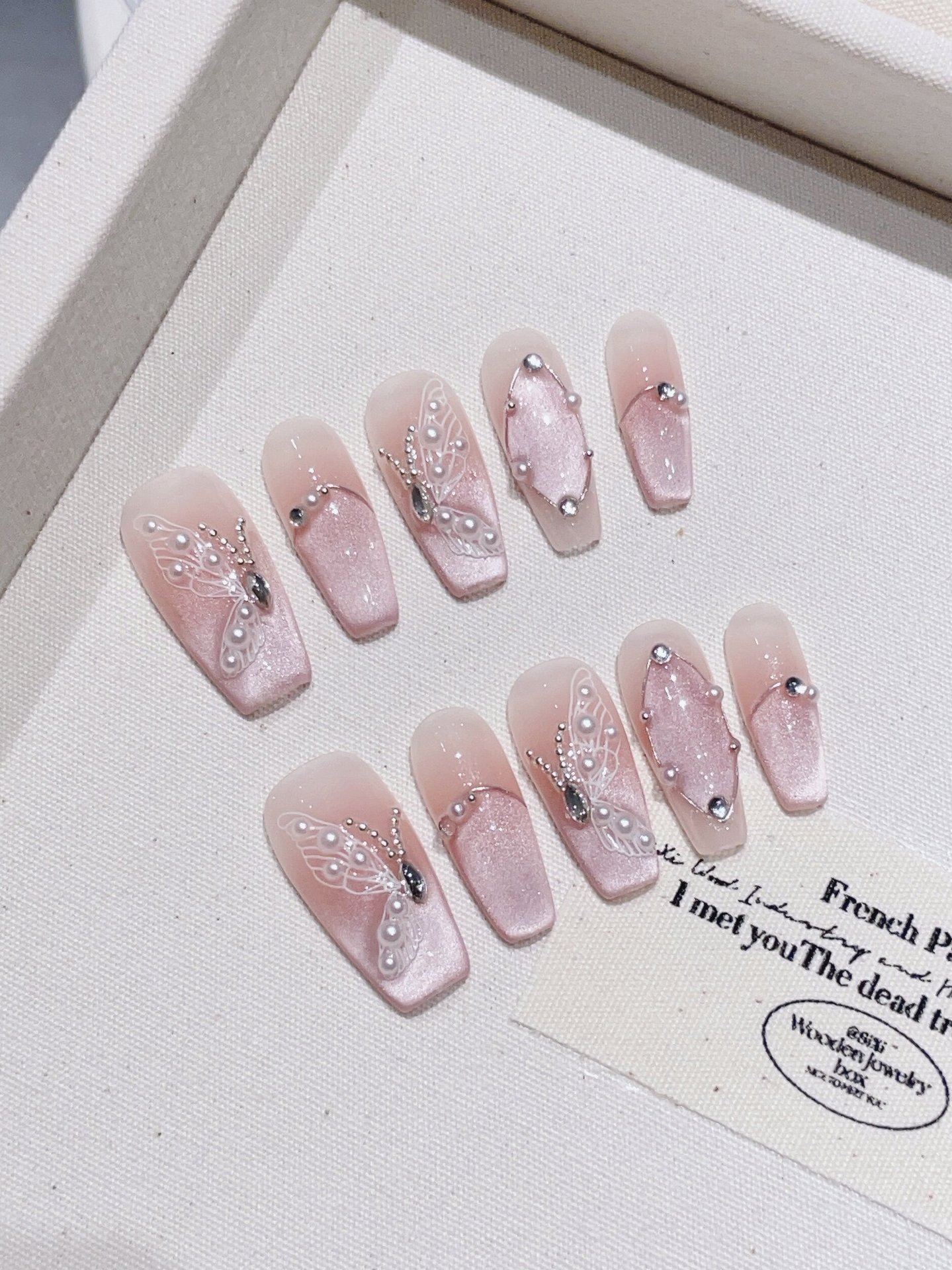 新款精品纯手工穿戴甲蝴蝶猫眼钻高级感法式轻奢光疗美甲贴片
