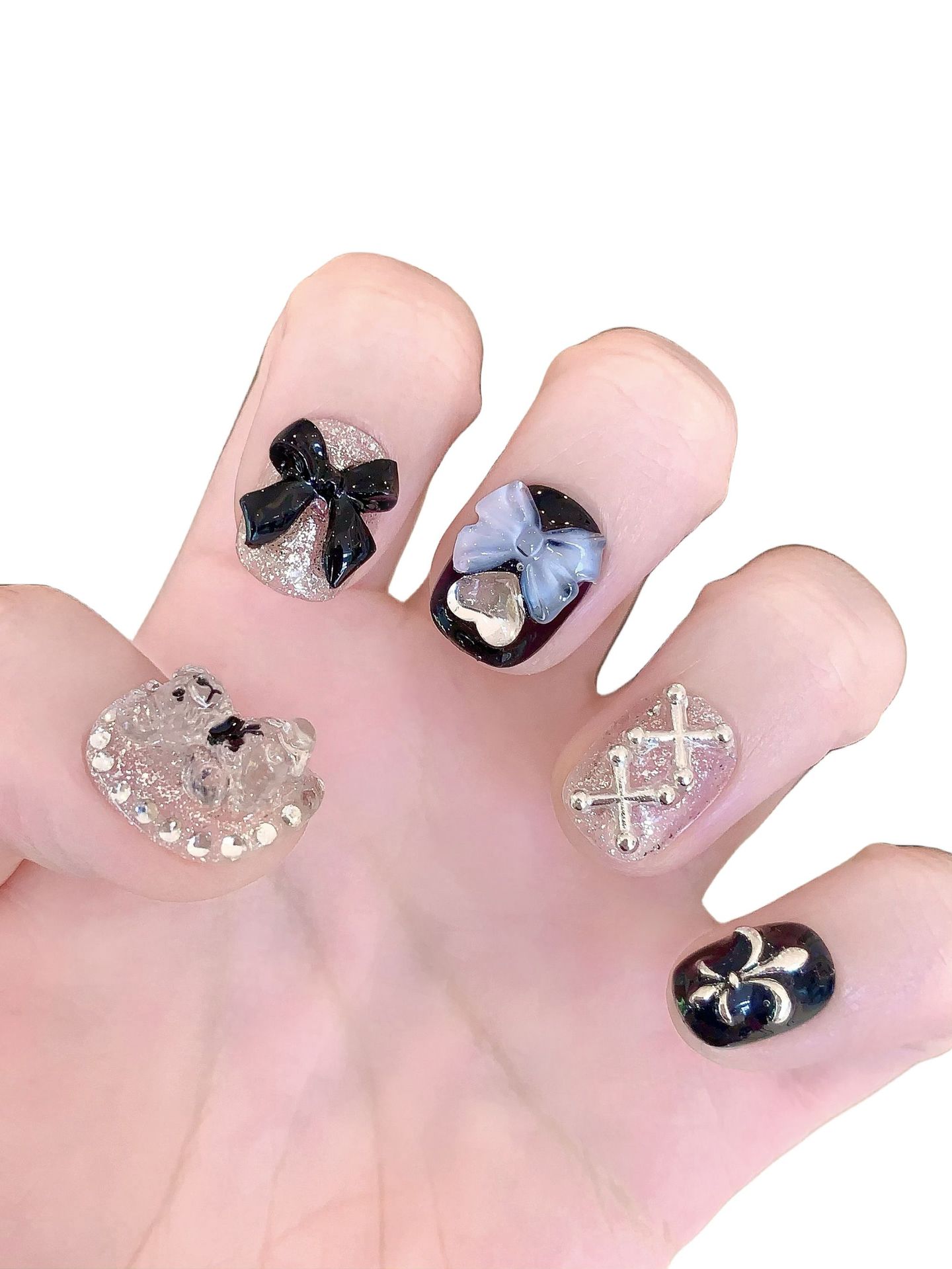 【原创实拍】纯手工穿戴甲新款网红蝴蝶结黑白小熊美甲贴片成品甲