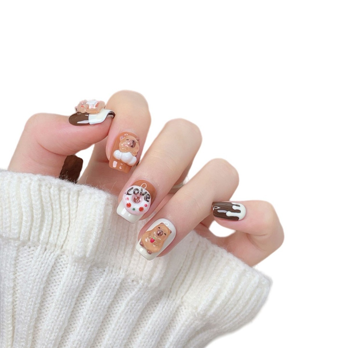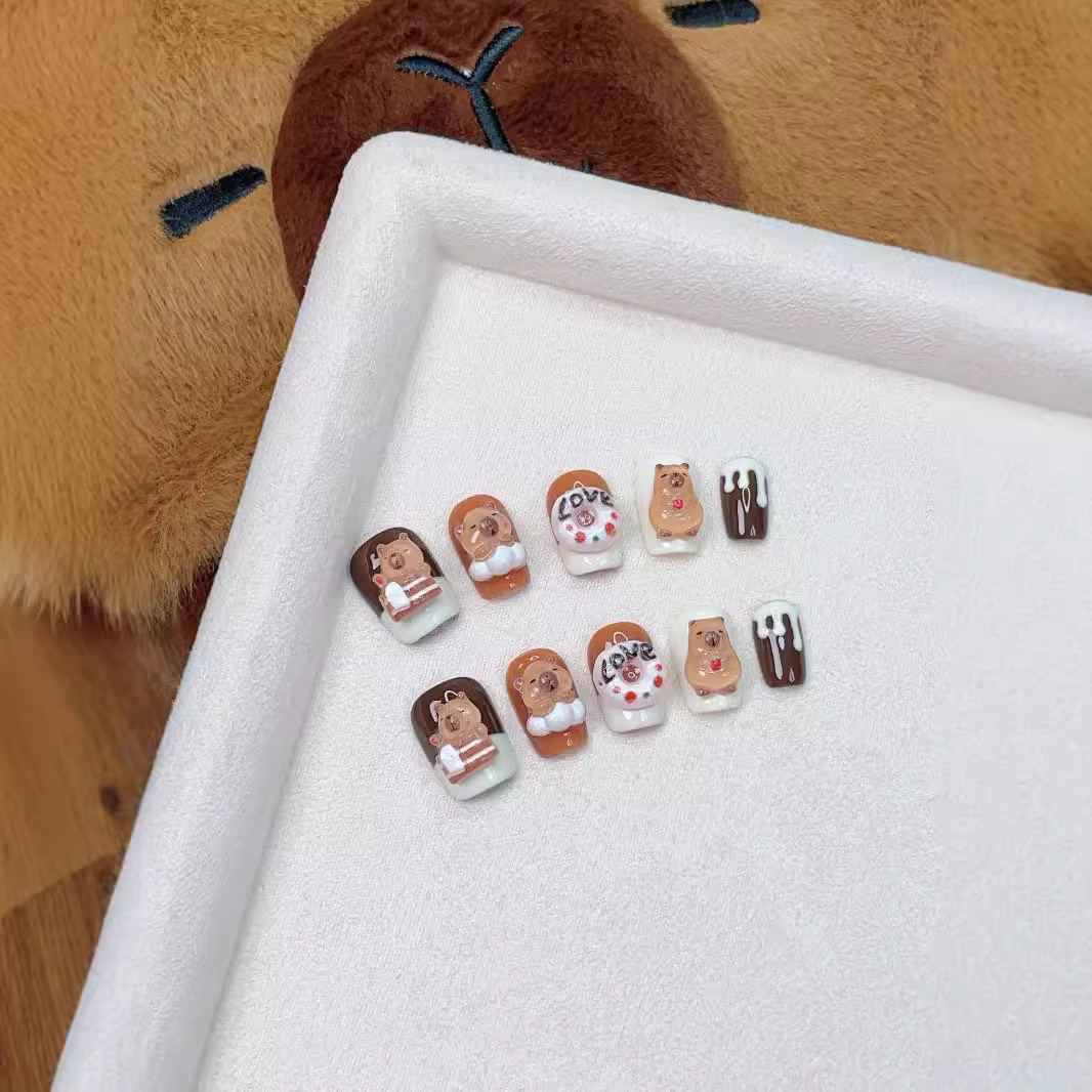 新款可爱风秋冬小短甲纯手工穿戴甲卡通卡皮巴拉小熊甜甜圈指甲贴