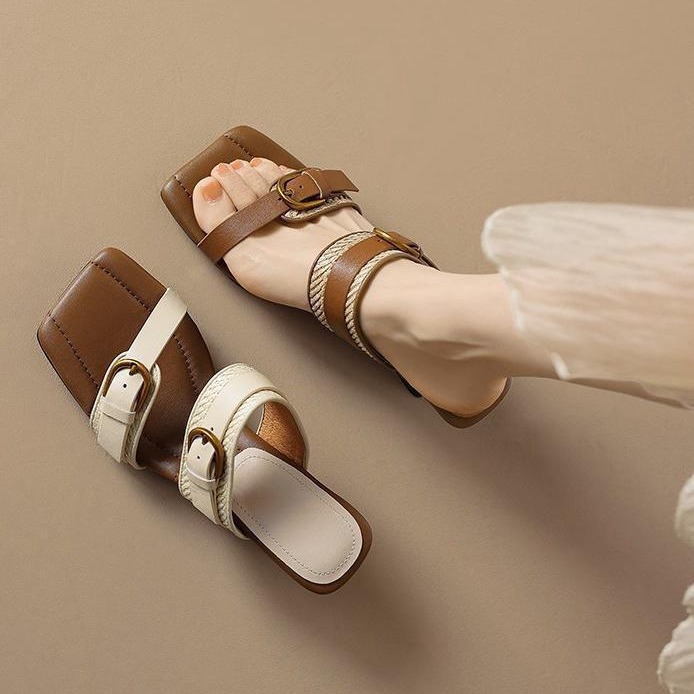 方头编织皮带扣一字拖女夏新款复古风百搭坡跟凉拖鞋