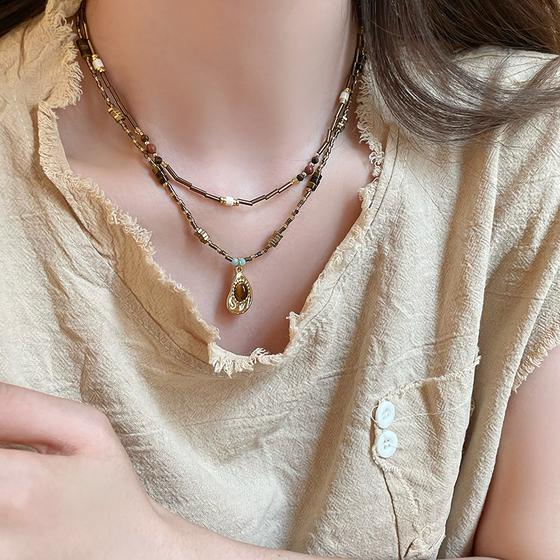 美式虎眼石串珠吊坠项链女复古高级感锁骨链新款甜酷颈链配饰