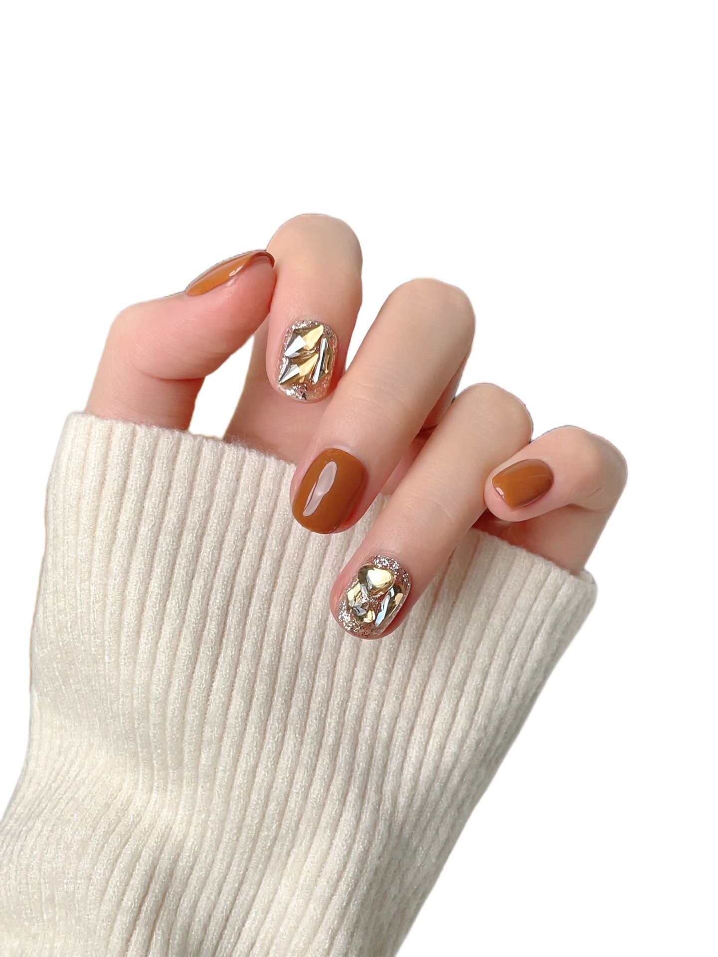 【原创实拍】秋冬新款穿戴甲琥珀咖色棕纯手工美甲贴片香槟爆闪短
