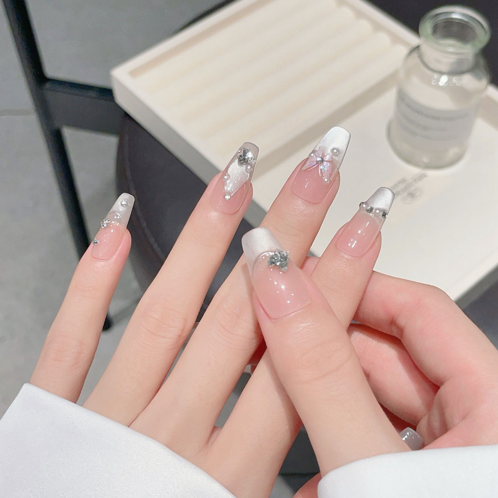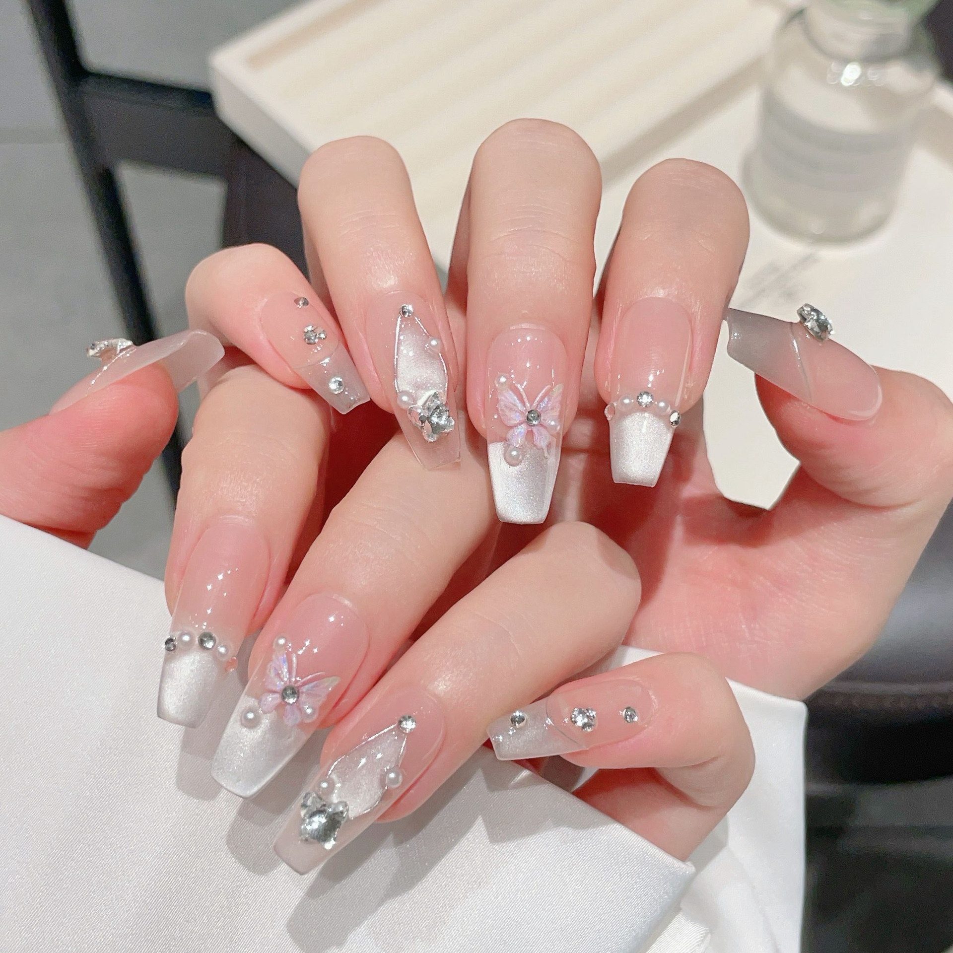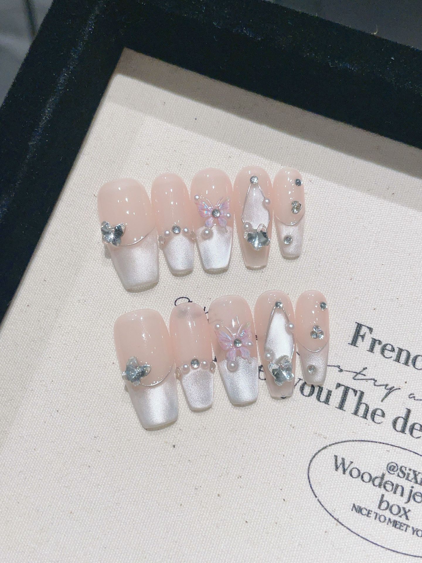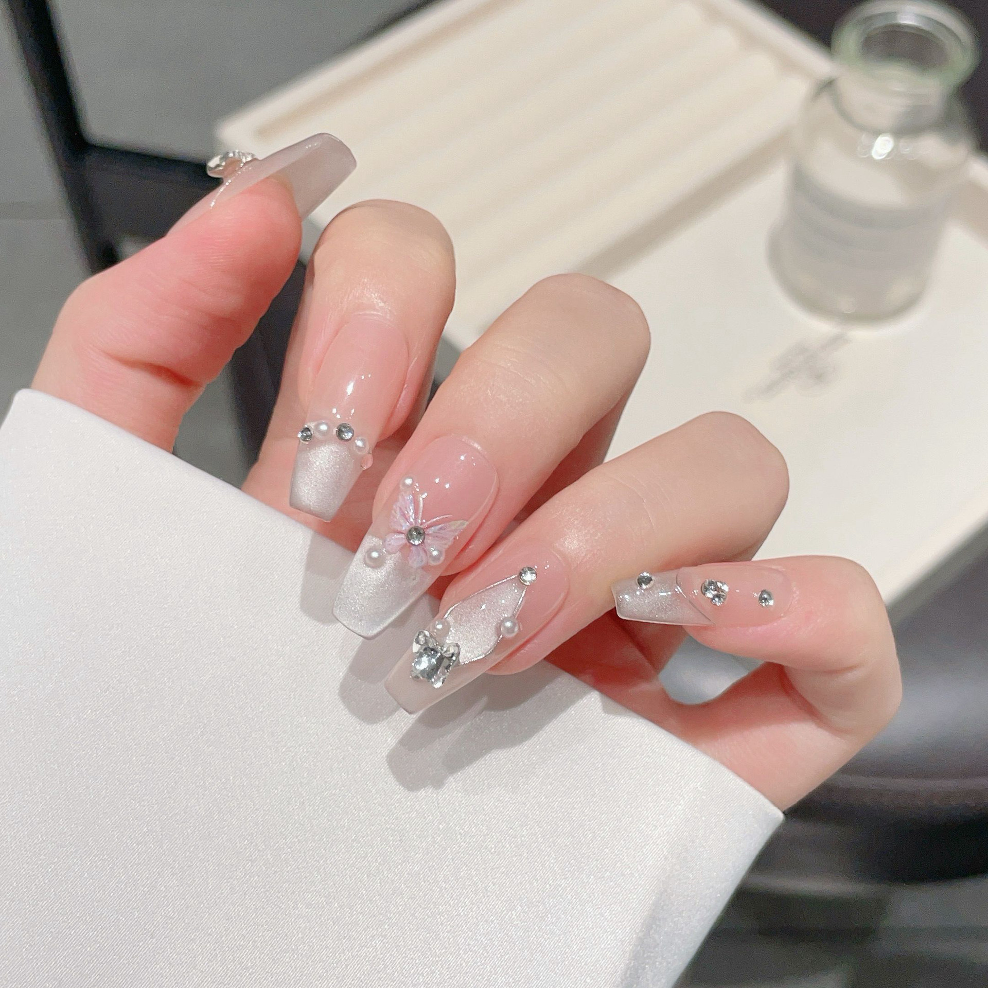 新款纯手工穿戴甲片高级感法式猫眼蝴蝶爆闪钻轻奢可拆卸重复使用
