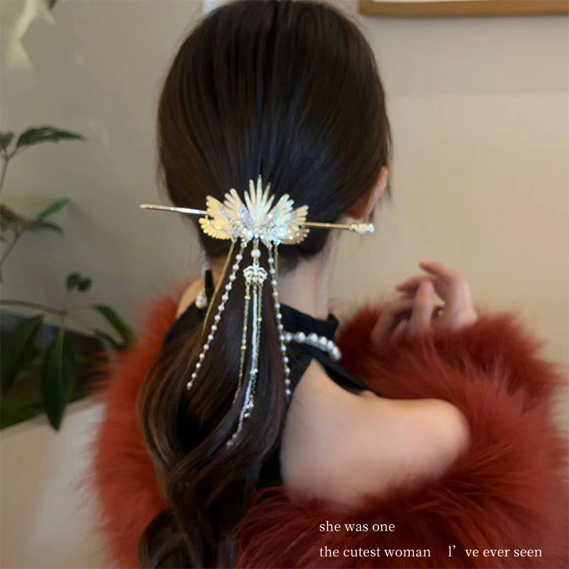 珍珠流苏天使翅膀发簪新中式金属簪子后脑勺盘发发钗高级感发饰女