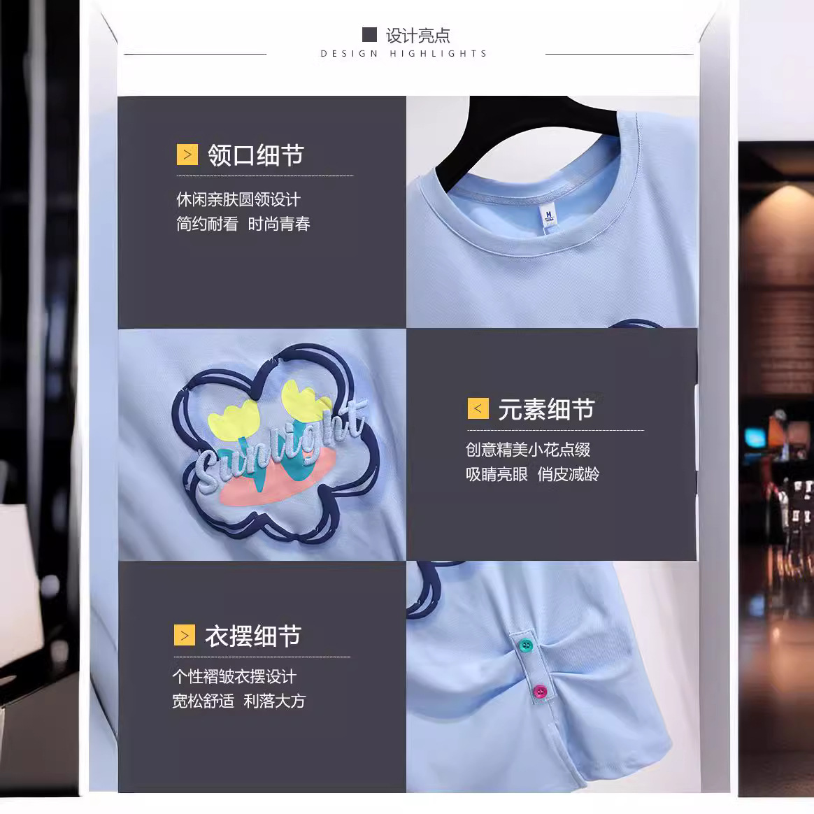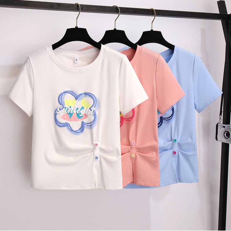 侧边褶皱短袖短裤修身T恤女年夏季新款设计感少女穿搭上衣