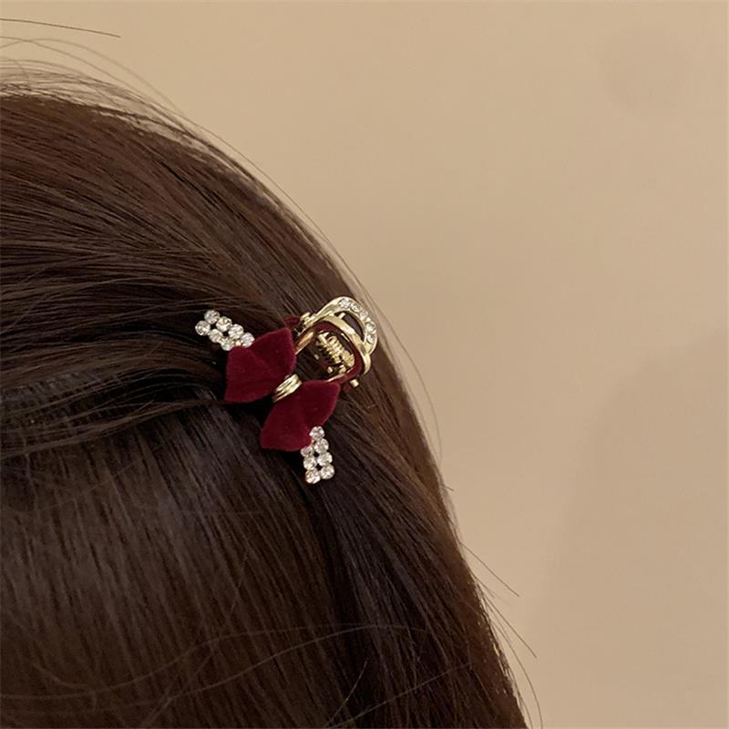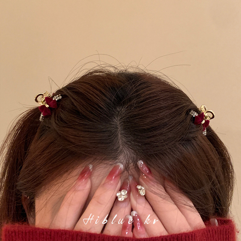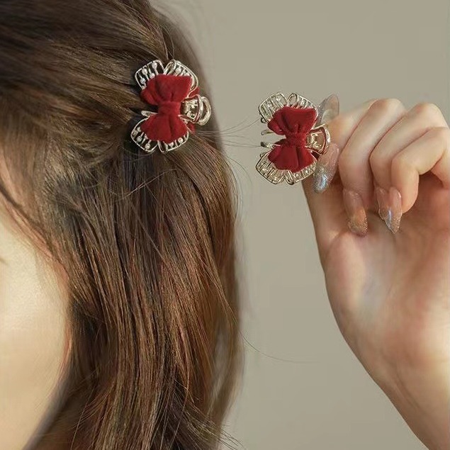 ins高级感酒红色丝绒蝴蝶结小号发饰抓夹女公主头发夹边夹刘海夹