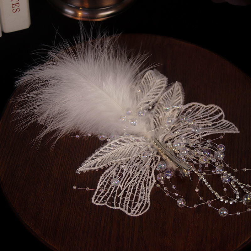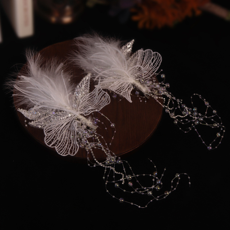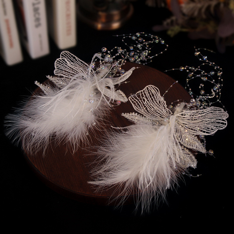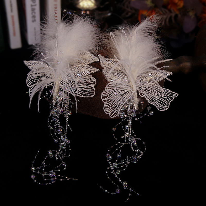 ins超仙发夹唯美精制手工白色羽毛流苏蕾丝对夹新娘结婚礼服发饰