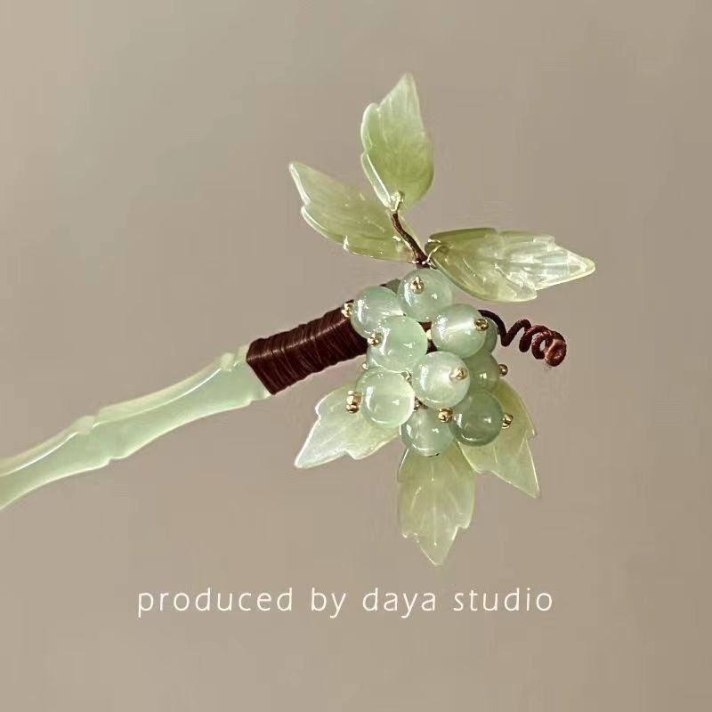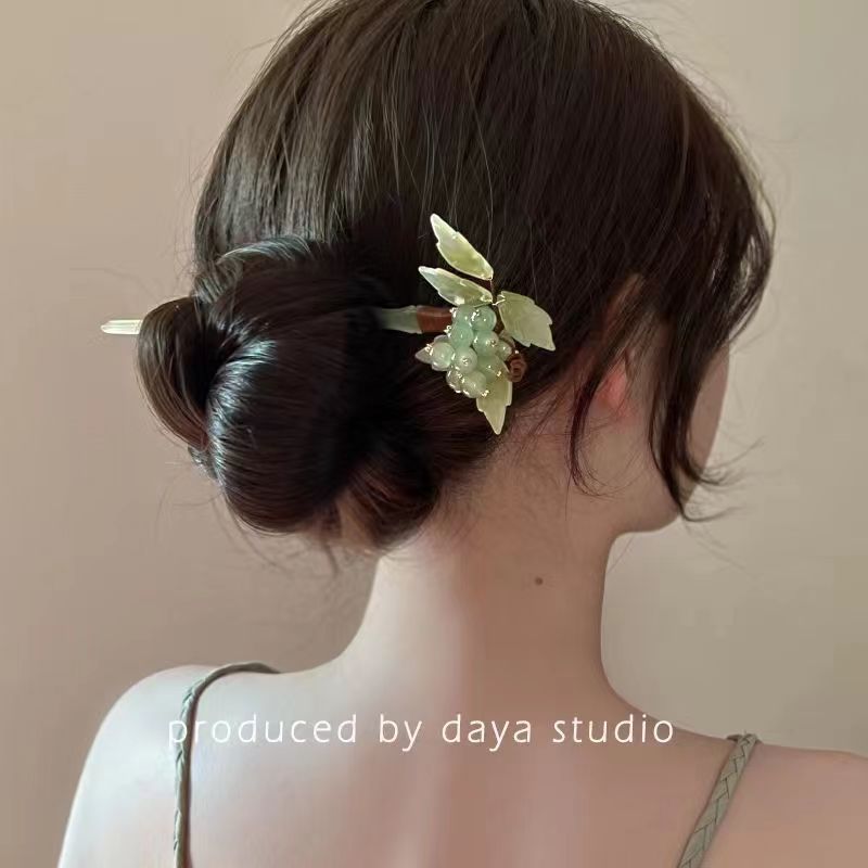新中式温柔仙气绿色串珠发簪 复古高级感葡萄发钗丸子头盘发簪子