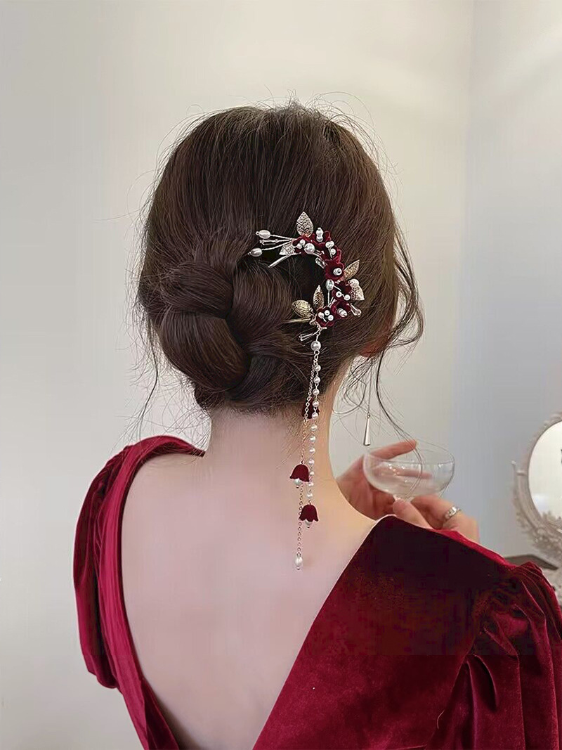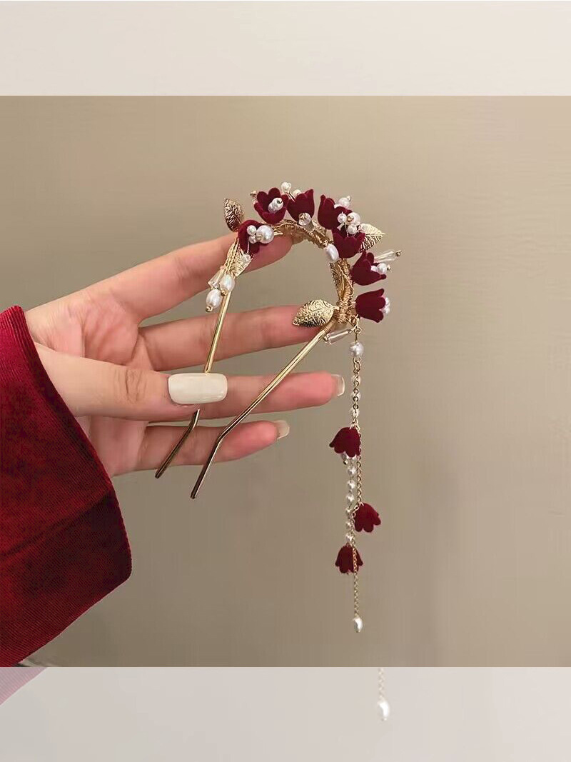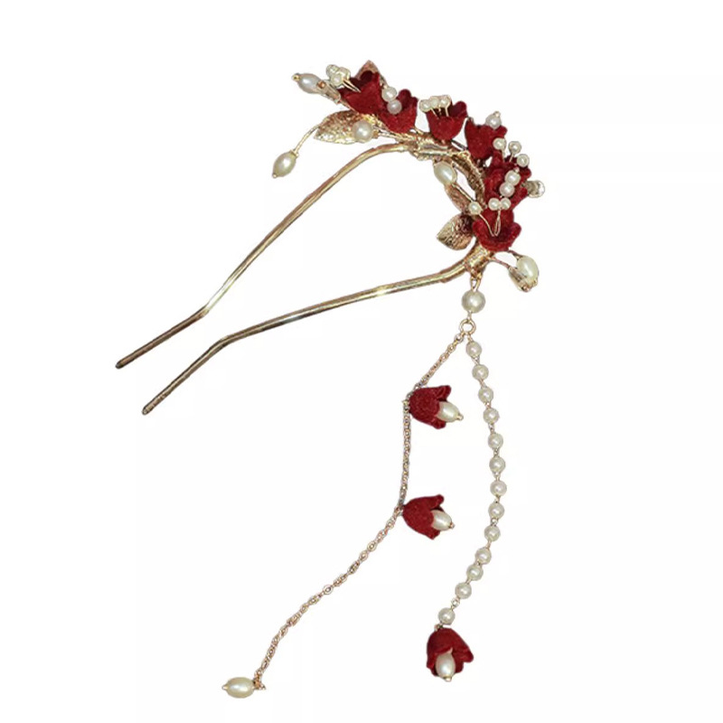 囍~精致红色流苏U发簪女古风高级感盘发新娘头饰品新中式旗袍簪子