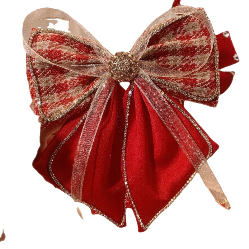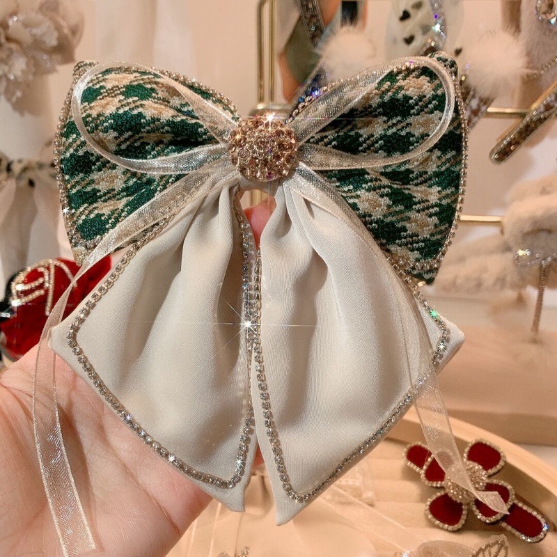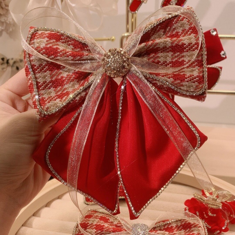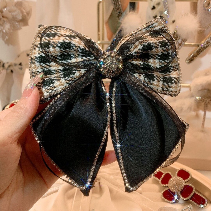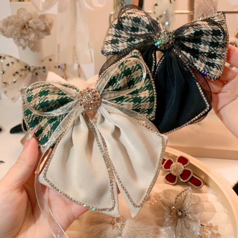 ins超仙新款千鸟格雪纺甜美潮流大气蝴蝶结气质感弹簧夹婚礼发饰