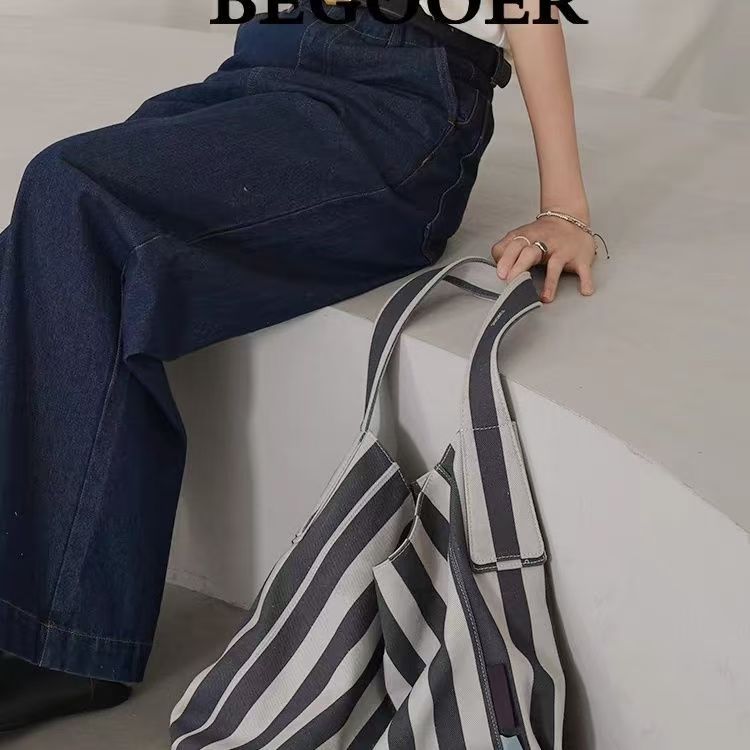 原创松弛感帆布随行包女度假风条纹电脑包学生通勤单肩包托特大包