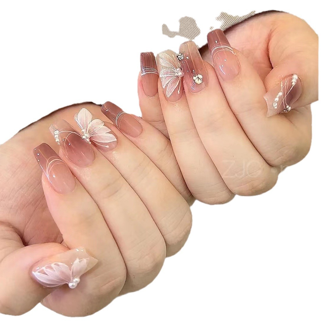 实拍穿戴甲手工美甲成品假指甲贴片小仙女裸色腮红手绘拉丝山茶花