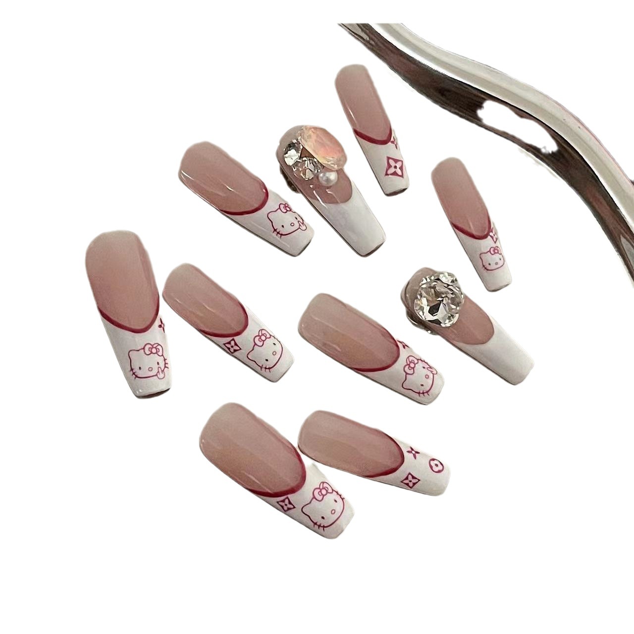 纯手工美甲穿戴甲假指甲贴片日式可爱kitty猫新款裸色法式爆闪钻