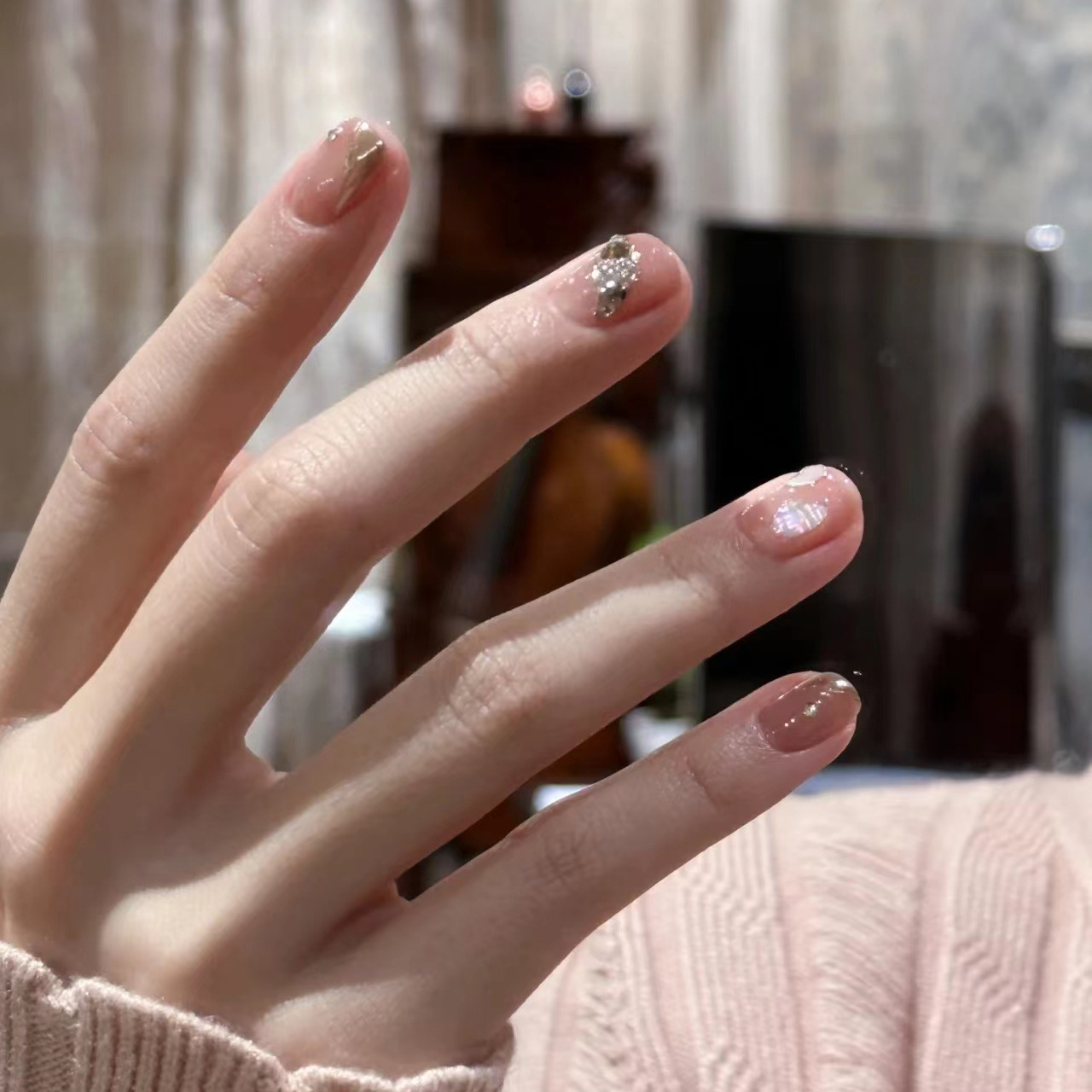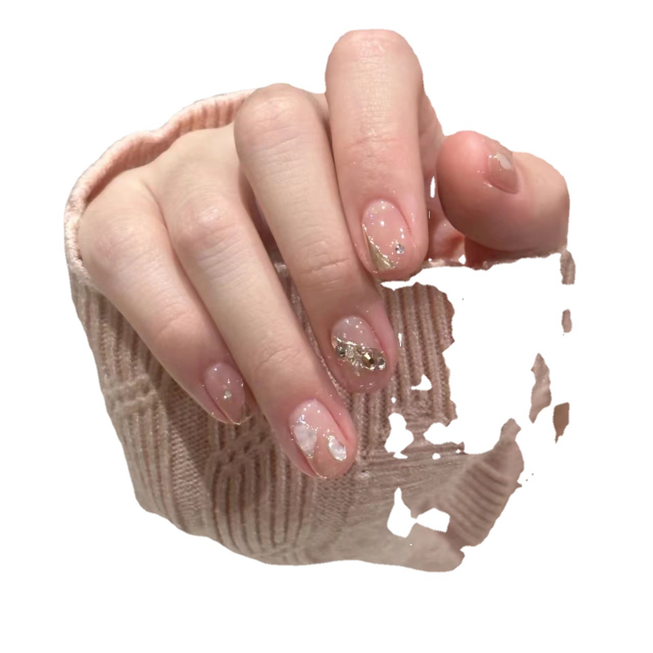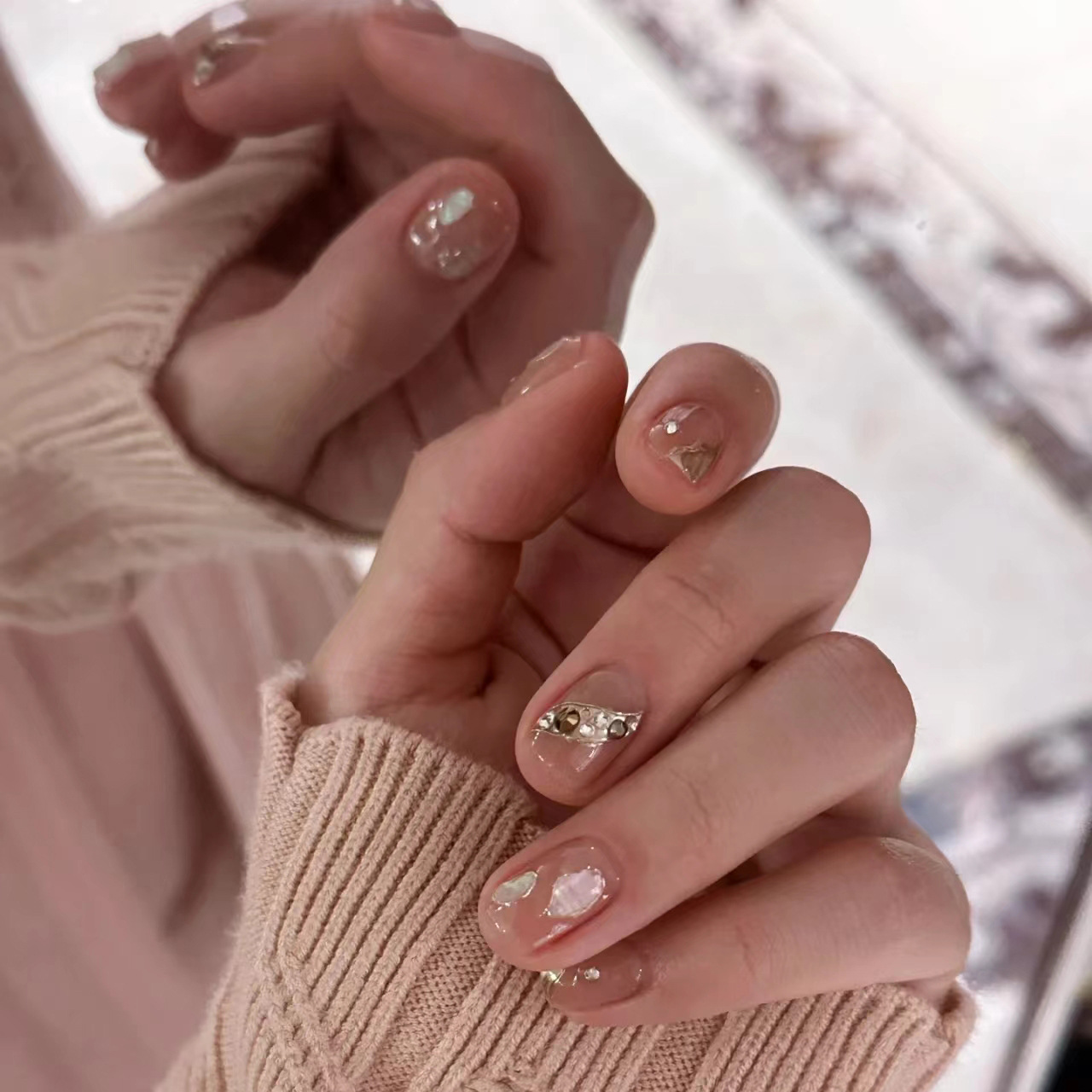新款纯手工美甲穿戴甲裸色魔镜不规则贝壳胶镶钻短款学生爆款