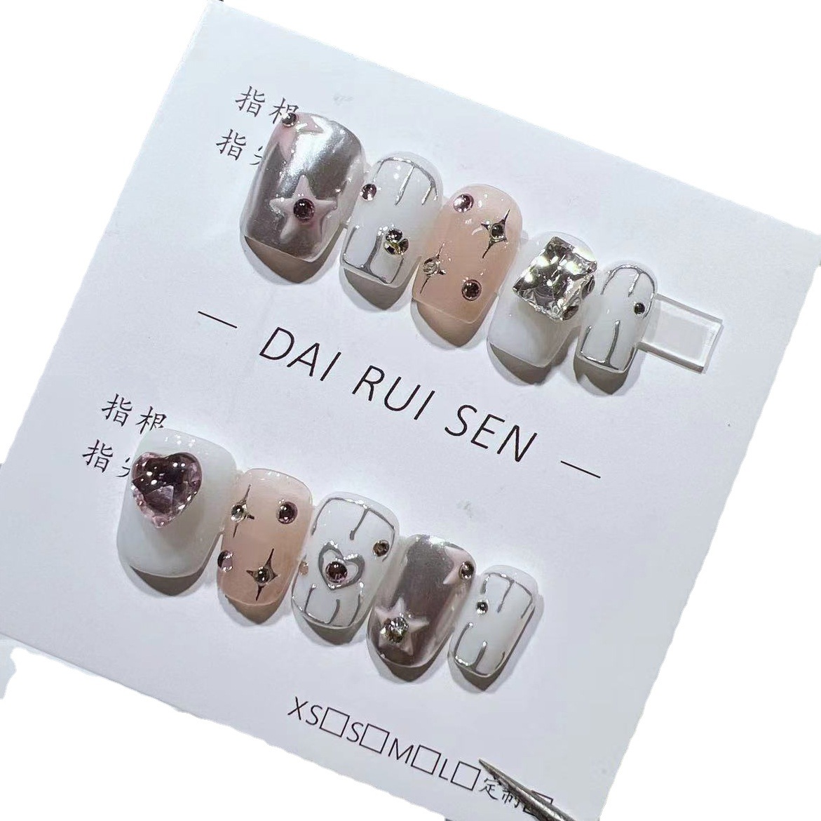 纯手工美甲穿戴甲假指甲贴片美甲成品爆闪钻镂空魔镜粉爱心可拆卸