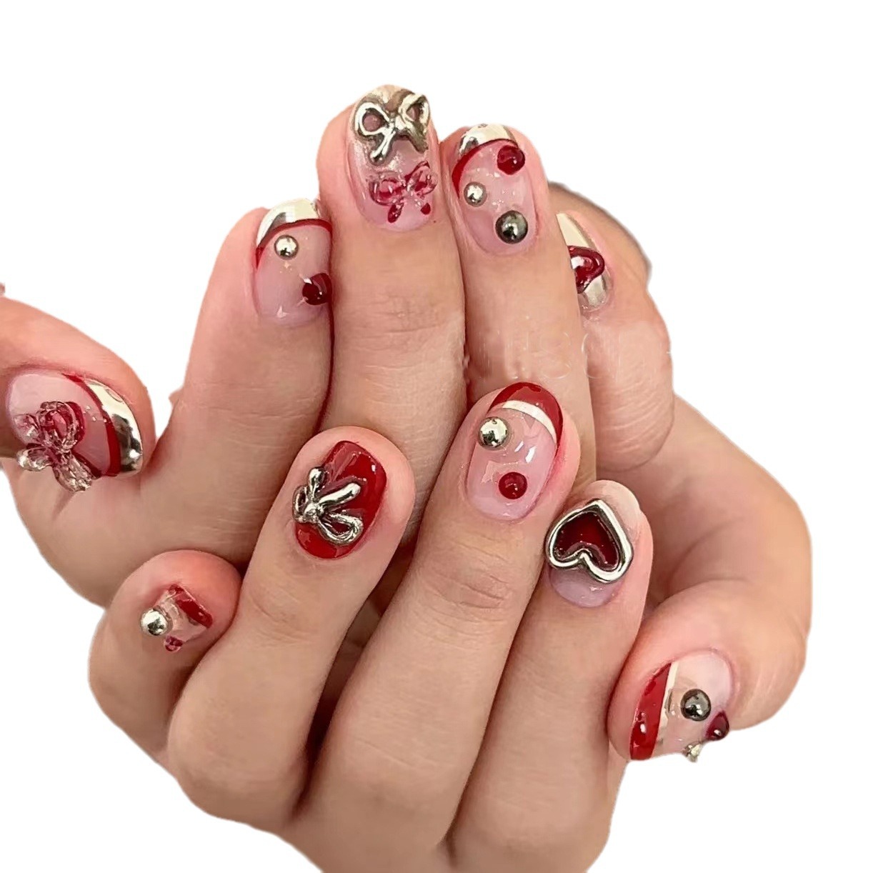 穿戴甲纯手工美甲成品假指甲贴酒红魔镜法式爱心蝴蝶结穿戴甲