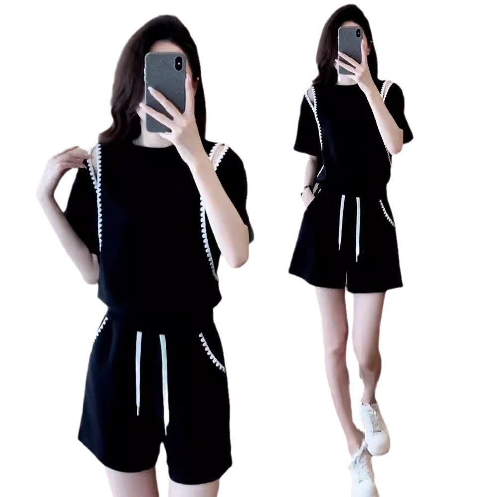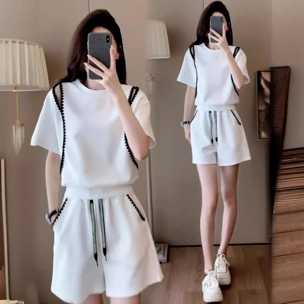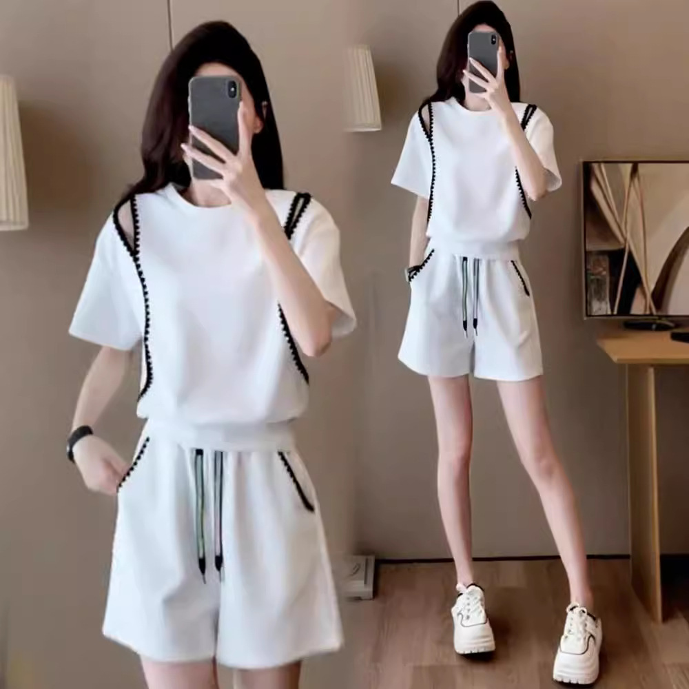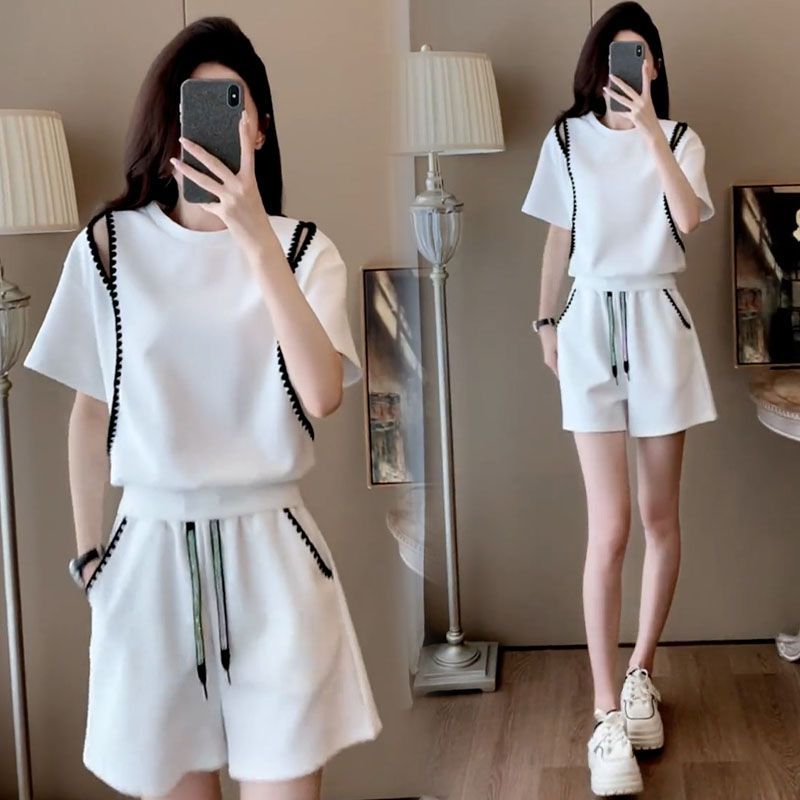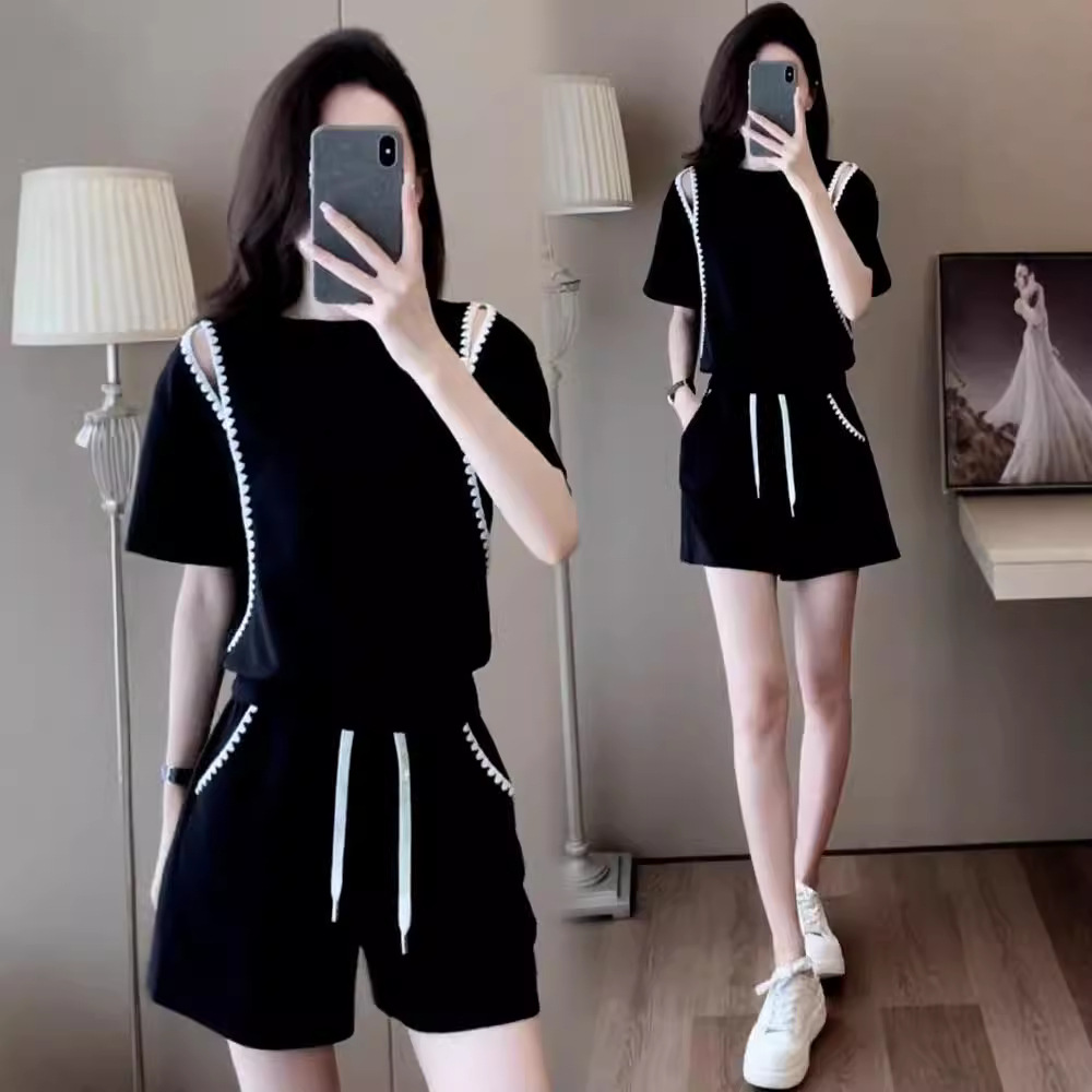 休闲运动服套装女夏季新款露肩短袖小个子爆款高腰短裤两件套